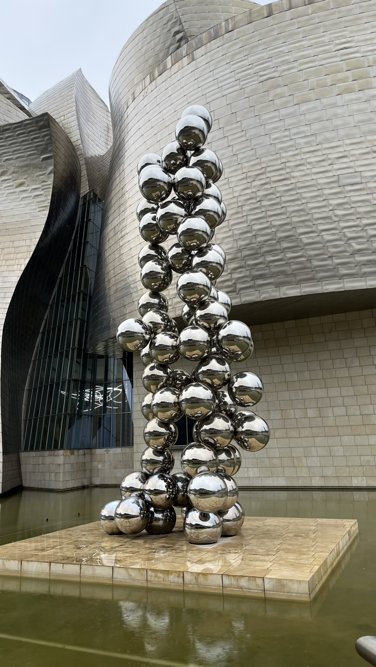 강을 따라 내려가니 빌바오 구겐하임 미술관(Guggenheim Bilbao Museoa)이 보인다. 빌바오를 찾은 단 하나의 이유다. 황금색 티타늄 조각으로 온몸을 감싼 건물이 빗물에 반짝이다. 먼저 눈에 들어는 건 둥근 쇠공으로 만든 ‘큰 나무와 눈(Tall Tree & The Eye)이라는 작품이다.