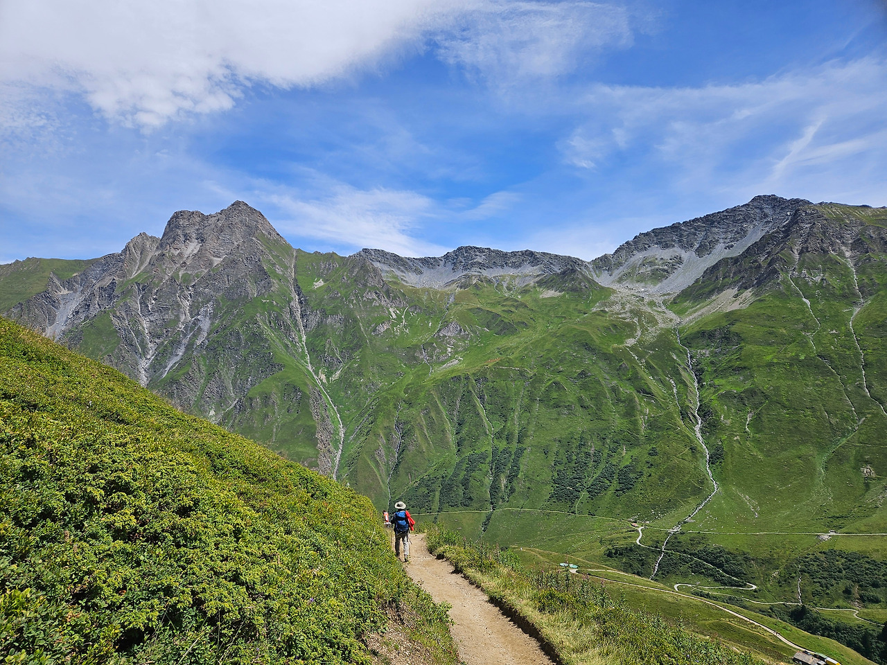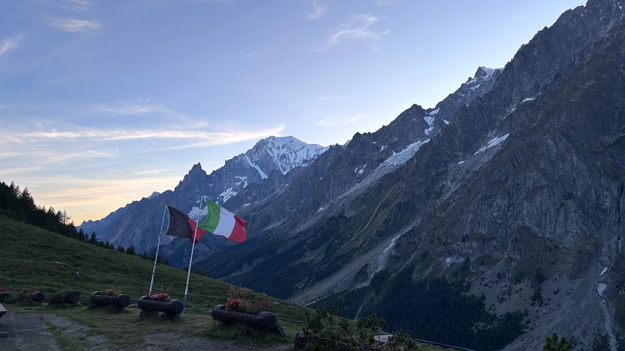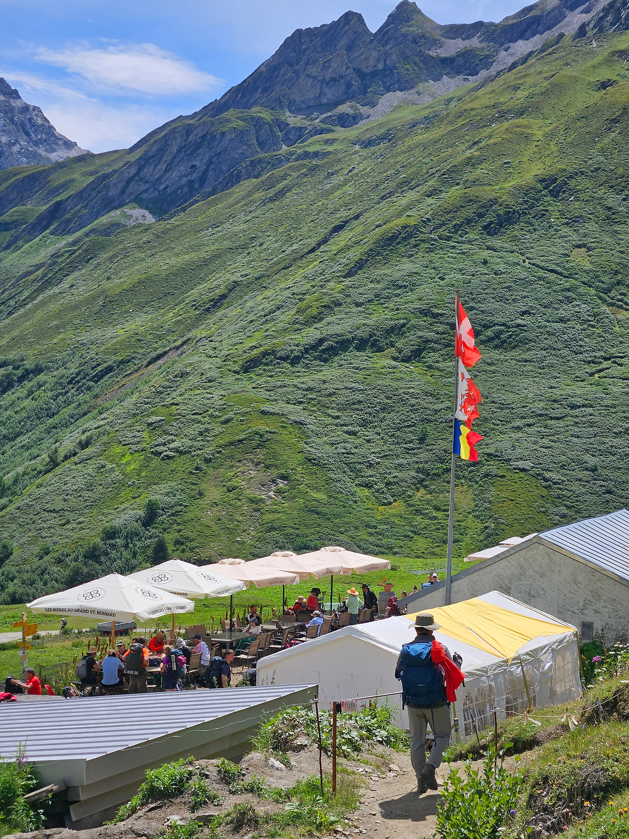 페레로 내려가는 길은 길고 완만한 경사다. 7월 몽블랑의 햇살은 눈부시고 그 햇살을 머금은 풀과 들꽃은 주체할 수 없는 기쁨을 온몸으로 발산하는 중이다. 싱그러운 생명이 온 산과 들과 계곡에 퍼져 있고, 그 생명들 사이로 난 좁은 길을 따라 수많은 트레커들이 기쁨을 호흡하며 천천히 오르내린다. 내리막을 거의 내려왔을 즈음에 La Peule 카페가 있다. 이 카페 중앙의 높은 깃대에 스위스 국기, 발레주 깃발, 그리고 무슨 의미인지 루마니아 국기가 매달려 펄럭였다. 이곳에서 보스턴에서 온 제시카를 다시 만나 안부를 묻고 다음 일정을 응원했다. 제임스 형이 사 주신 시원한 맥주로 지나 온 시간에 대해 잠시 이야기를 나누었다. 페레 마을에서 라폴리까지는 버스를 탈 수 있다고 한다. 제임스 형은 정말 아는 정보가 많다. 버스 타는 곳까지도 한 시간이 넘는 거리라 시간 맞추어 일어났다. 걸음이 빠른 제임스 형은 먼저 내려가고, 우리는 간발의 차이로 버스를 타지 못했다. 몽블랑 일정을 마치고 스위스 융프라우 쪽으로 가는 제임스 형은 버스 안에서 손을 흔들며 다음 인연을 기약했다. 다음 버스는 한 시간 반이나 기다려야 하고, 트레킹은 원래 걷는 것이니까 버스를 타지 못했다고 아쉬울 것도 없었다.