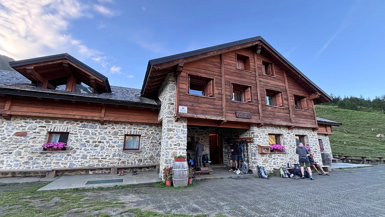 보나티 산장은 몽블랑 산군을 파노라마처럼 볼 수 있는 멋진 곳이고, TMB를 하는 트레커들이 꼭 하룻밤 묵고 싶어 하는 성지 같은 곳이다. 그만큼 예약도 어렵다. 2인실, 4인실, 다인실 등 형태에 따라 가격도 다르다. 다인실은 7개의 침대가 양쪽 벽면에 나란히 붙어 있고, 중앙에 칸막이 겸 배낭과 옷을 보관할 수 있는 보관대가 있는 형태다. 등산화는 아래층에 따로 보관하고 산장에서 준비해 둔 슬리퍼로 갈아 신는다. 화장실과 샤워실도 깨끗하고 더운물 샤워도 가능하다. 콘센트는 방문 옆에 하나밖에 없어서 충전하는 데는 다소 불편하다. 저녁 식사는 두 시간짜리 최고의 풀 코스라고 해서 잔뜩 기대를 했는데, 나쁘지는 않았지만 '최고'라고 하기에는 다소 부족함이 있었다. 저녁 식사 시간이 두 시간이 걸리는 건 음식 하나가 나오고 다음 음식이 나오는데 시간이 많이 걸리기 때문이었다.