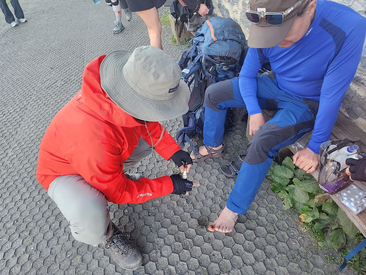 이른 아침 햇살을 받은 그랑조라스(les Grandes Jorassses, 4208m)는 어제와는 또 다른 모습으로 다가왔다. 등산화 끈을 조이고 출발 준비를 하는데, 어제 오후에 산장 앞에서 사진을 찍어 드린 한국분을 다시 만났다. 벤치에 앉아 채비 중인데 양말도 신지 않은 슬리퍼 차림이다. 엄지발톱이 살을 파고들어 피가 나고 부었다. 가방에서 약주머니를 꺼내 프로폴리스액으로 소독하고 밴드를 발라 드렸다. 비상약은 아무것도 챙겨 오지 않았다고 해서 여분의 밴드도 챙겨 드렸다. 약을 발랐다고 해도 상처가 아물 때까지는 며칠 걸릴 텐데... 이틀 전, 베르토네 산장을 지나 올라가는 길에 프랑스 청년이 길가에 앉아 발을 살펴보고 있는 걸 보고, 가져온 바늘에 실을 꿰어 물집을 터뜨리고 소독해 줬었다. 다행히 물집이 크지 않았지만, 그 정도로도 쓰리고 아프다. 산티아고 첫 순례 때 발에 생긴 물집 때문에 고생을 많이 한 생각이 나서 그냥 지나칠 수 없었다.