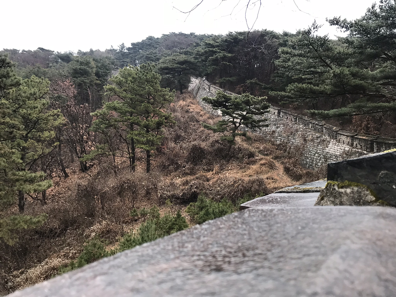 성안에서의 성벽은 높지 않았으나 성 밖의 경사면이 깊어 밖에서 보는 성벽은 높았다. 성 안에서 성벽에 서면 가슴 높이에 닿았다. 성 밖으로 숲이 길게 이어져 있고, 그 너머에 도시의 아파트 숲이 보였다. 나무의 숲은 따스하고 아파트의 숲은 차가웠다. 특히 성 안의 숲은 눈발이 날리는 날씨에도 따스하고 고왔다. 눈이 녹은 물 위에 내려앉은 늙은 단풍이 긴 시간의 간격을 잠시 떠 올리게 했다.