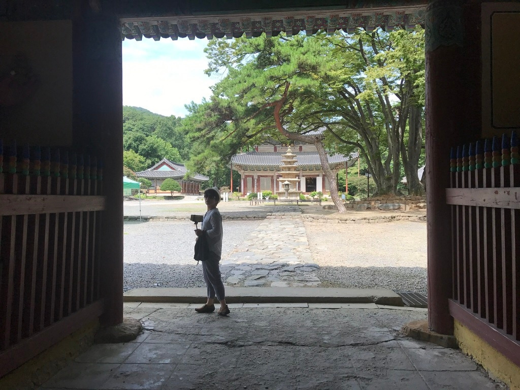 일주문에서 본당까지는 천천히 걸어도 채 10분도 걸리지 않는 거리다. 급하지 않는 경사를 이룬 길을 따라 올라간다. 시멘트 블록으로 길을 포장해 놓아서 옛 정취를 느낄 수 없다는 것이 아쉽다. 천왕문에 서서 보는 풍경이 특이하다. 천왕문이 마치 사진기의 프레임처럼 절 안의 모습이 그 속으로 들어 온다. 오른쪽에 선 노송의 푸른 솔잎이 땅에 닿을 듯이 내려와 있고, 그 아래로 조그마한 석등과 그보다 크고 높은 오층석탑이 보이는데 그 뒤로 이 절의 본당인 극락전이다. 오층석탑이 극락전의 중심을 가리고 있는 모양새다. 가까이 가서 보니 오층석탑은 정림사지 오층석탑과 모양새가 아주 닮았다. 석탑 앞에 있는 설명 자료에도 그렇게 쓰여 있다.