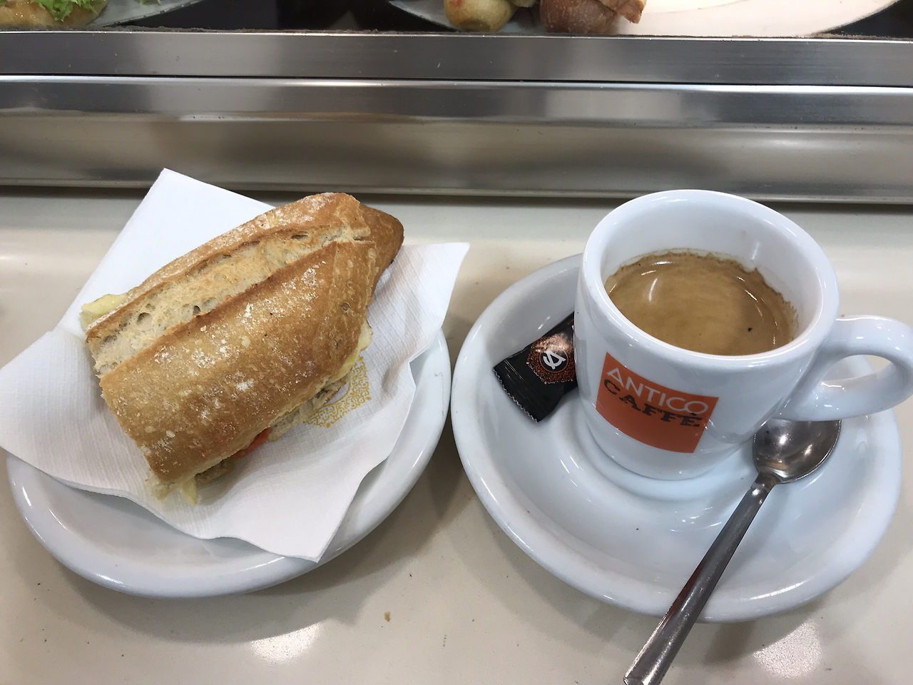 구엘공원에 무료입장(오전 8시 이전) 하기 위해 일찍 일어나 서둘렀으나 결국 늦었다. 어차피 늦었으니 아침이라도 먹고 버스를 타자 싶어 길가 카페를 찾아 들어갔다. 버스 정류장 근처 카페인데 사람이 많이 몰려있다. 이런 곳은 언제나 후회 없는 선택이다. 에스프레소(1.2유로)와 바케트 빵에 샐러드 소스를 넣은 파타테스(3.35유로)로 아침 기운을 차렸다.