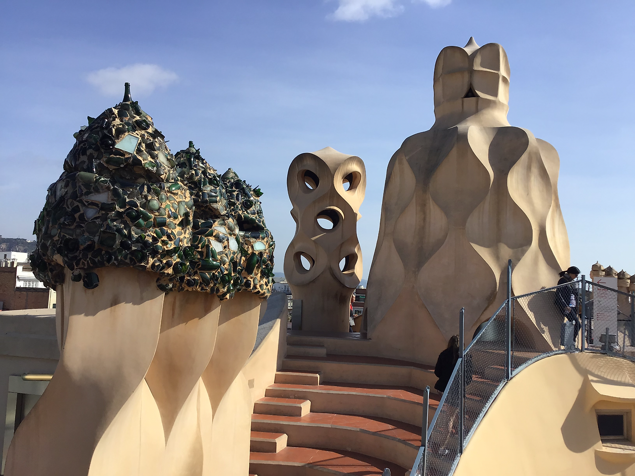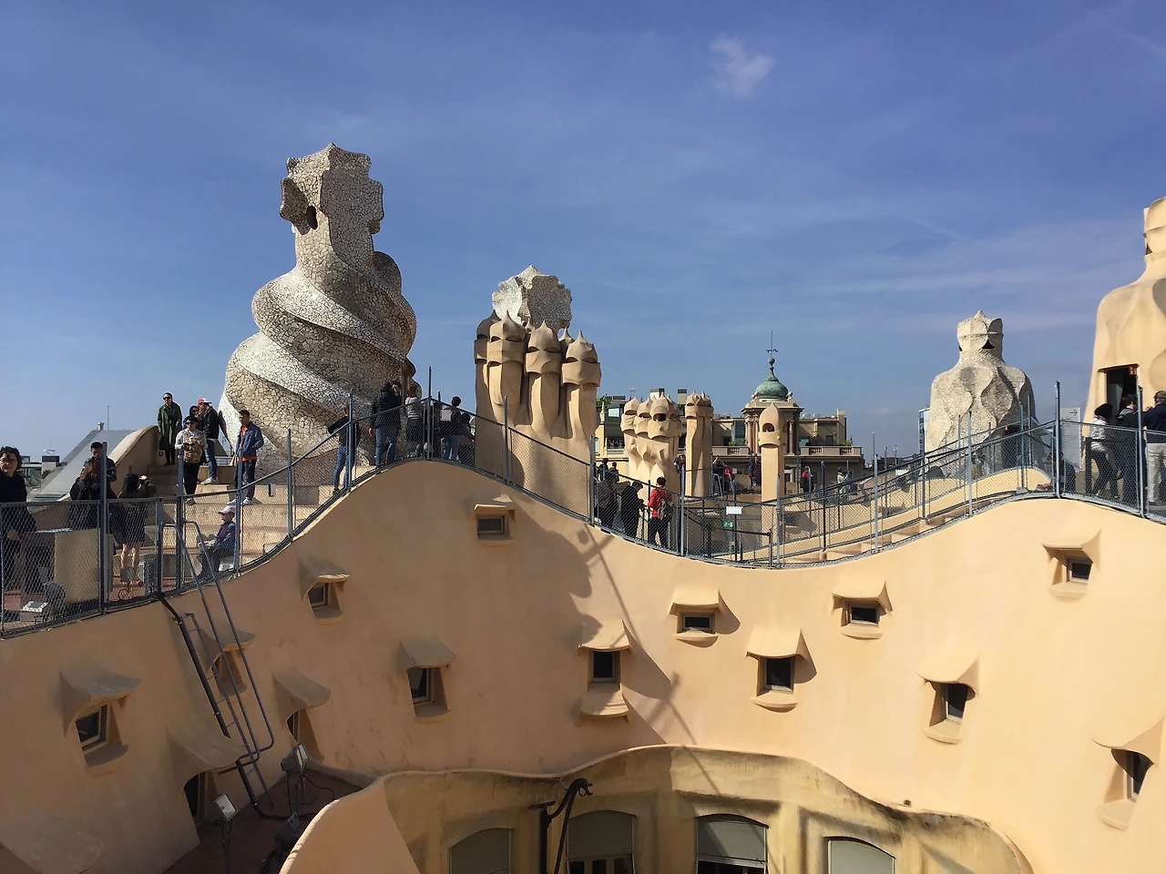 엘리베이터를 타고 오르면, 세계에서 가장 아름다운 옥상을 만나게 된다. 저것들이 도대체 무엇인가? 물, 바람, 나무... 재료는 콘크리트지만 기존에 알던 콘크리트가 아니라 바람에 휘어지고 햇볕을 받고 자라는 생물들이 꿈틀거린다. 관광객들은 그 생물들을 만지고 쓰다듬고 손으로 교감한다. 그러고 보면 바르셀로나의 건물은 비슷비슷하면서도 같은 건물이 하나도 없다. 바로 옆 건물과 높이는 비슷하지만 창문의 모양과 색깔, 테라스의 디자인이 다 제각각이다. 그 안에 사는 사람들이 모두 제각각 이듯이. 건물을 이렇게 짓겠다는 사람과 그것은 지지한 사람, 그들 모두의 마음이 여기 이렇게 세상 사람들을 불러 모은다. 층계를 걸어 내려오면, 까사 밀라의 역사를 만날 수 있다. 100년 전 이곳에 살던 사람들의 숨결도 어렴풋이나마 느낄 수 있다.
