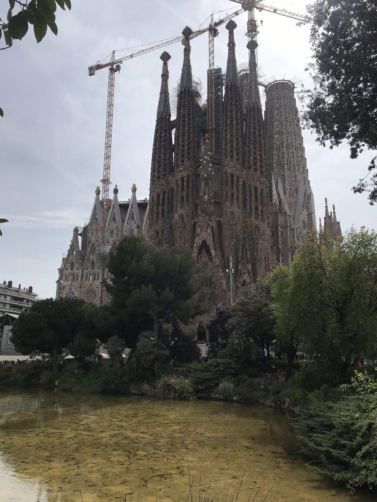 예약한 입장 시간이 되려면 아직 여유가 있어서 노천카페에 앉아 커피를 마시며 글을 썼다. 엊그제 써 놓은 ‘방콕에서의 운전’에 관한 이야기도 고치고, 바르셀로나 1일 차 여행기도 손 봤다. 한참을 앉아 있었더니 쌀쌀하다. 4월의 바르셀로나는 꽃샘추위가 가시지 않은 한국의 날씨와 거의 같다. 그래서 그런지 거리를 다니는 사람들의 옷차림이 제법 두텁다. 네 시가 되기 전에 자리를 털고 일어났다. 정문 쪽에는 여전히 사람들이 붐볐다. 길 건너에 작은 연못이 있는데, 그 연못 반대쪽에 가서 성당을 보니 전체 모습이 한눈에 들어온다. 사진 찍는 포인트다.