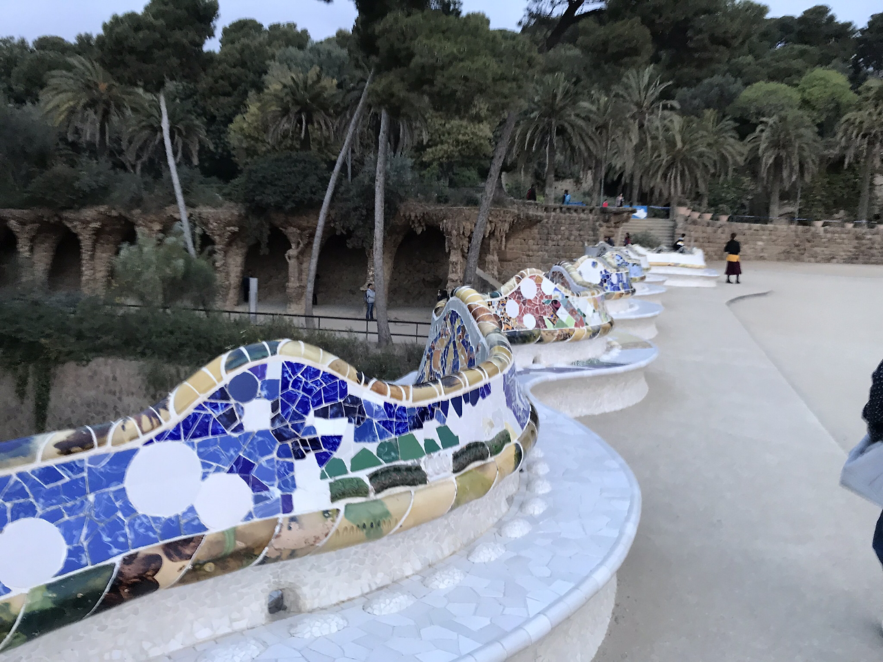 구엘공원은 바르셀로나의 건축가 안토니 가우디의 오랜 친구이자 후원자인 구엘(Eusebi Guell)과의 인연으로, 처음엔 주거용 주택단지로 건립되다가 도중에 일반인들을 위한 공원으로 변경되었다고 한다. 유료존의 특징은 형형색색의 타일로 만든 모자이크화다. 입구 쪽에서 걸어 올라가면 커다란 도마뱀을 만나게 된다. 낮시간에는 사람이 많아 사진을 찍으려면 한참이나 대기를 해야 한다고 하는데 이른 아침이라 그럴 필요가 없어 좋다. 바로 뒤에는 커다란 물고기 입 모양을 한 벤치가 있다. 기둥 옆을 돌아 올라가면 넓은 공간이 나온다. 공간의 테두리 부분이 온통 타일 모자이크로 되어 있다. 어느 한 곳 직선인 곳이 없다. 구부러지다가 다시 반대로 돌고 부드럽게 다시 이어진다. 동화 속의 장면 같기도 하고, 놀이동산에 온 것 같기도 하다. 어린아이의 소꿉장난 같은 마음이 언덕 위에 펼쳐져 있다. 원래 만들려고 했던 주거용 주택에 사람들이 살았다면, 아마도 그들은 모두 어린아이처럼 즐거워 했을 것이다.