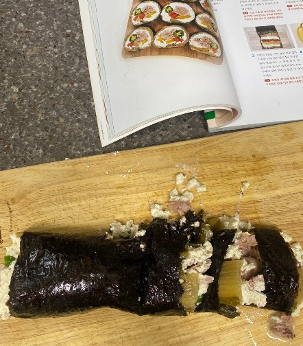 시키는 대로 묵은지 100g까지 저울에 올려 재고, 책에서 말하는 두부 1모는 몇 그램인지 꼼꼼히 살핀 후 레시피대로 정성스럽게 말았다. 예쁘게 말고 사진 찍어야지, 브런치에서 김밥 글을 좋아하던데 글도 써야지 콧노래를 부르며 드디어 완성! 이제 참기름 쓱쓱 바르고 잘라본다.