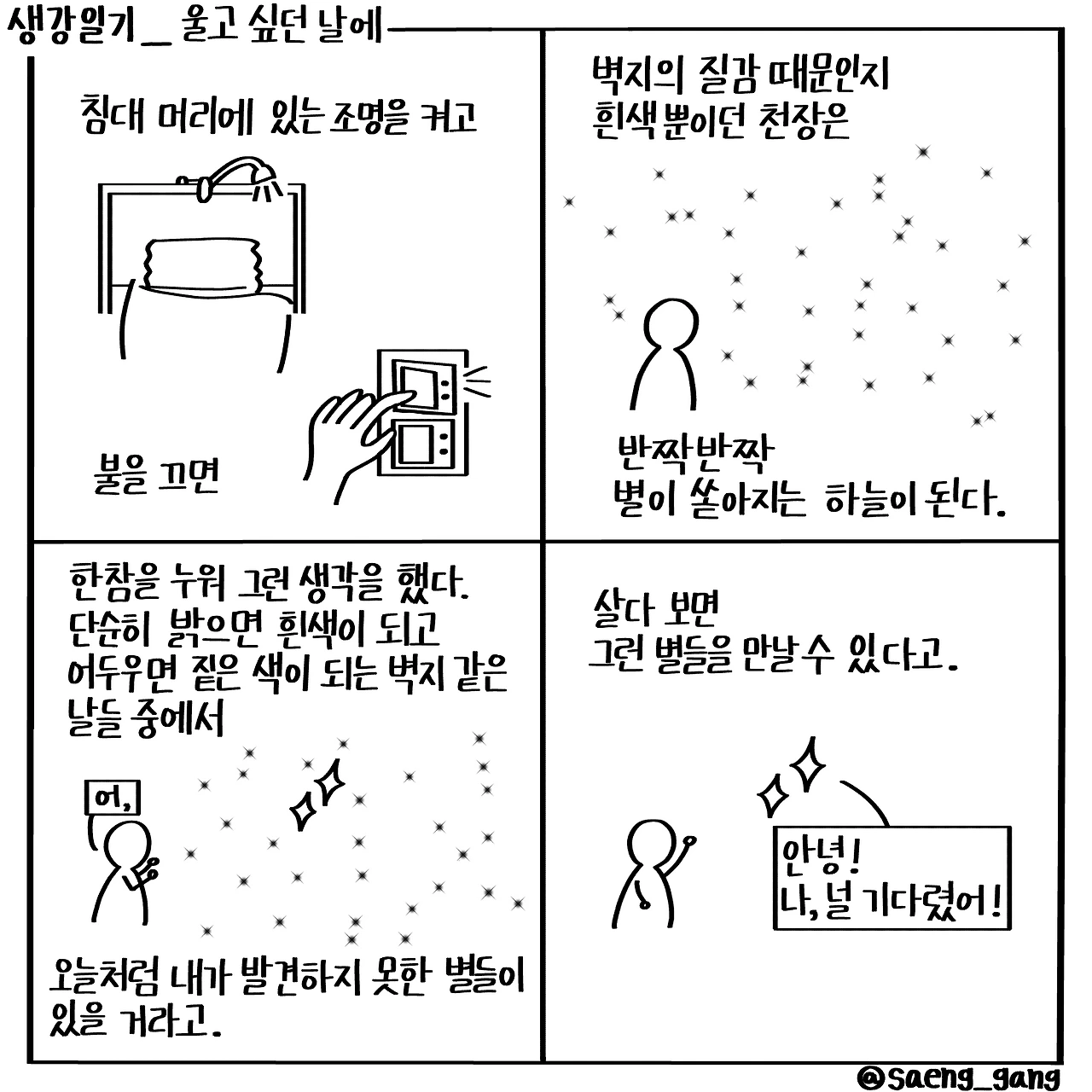 별이 쏟아지는 게 이런 걸까. 하얗고 오돌토돌한 흰색 천장에서 무수한 별들이 반짝이고 있었다.