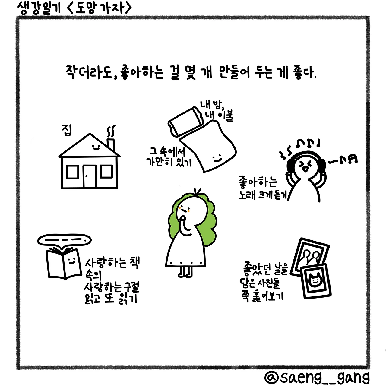 내겐 도망쳐도 갈 곳이 많아. 나는 고요 속에 잠겨 있는 게 좋아. 닳도록 읽은 책을 또 읽는 것도 좋아. 사진첩을 오랫동안 보는 것도 좋아해. 좋아하는 가수의 앨범을 전곡 재생해서 하루 종일 듣는 것도 좋아. 아무 말이나 내뱉으며 일기를 써 갈기는 것도 좋아하지. 너무 작은 일 같지. 그렇지만 나는 내 안식처를 구해 놓았다고 생각해.
