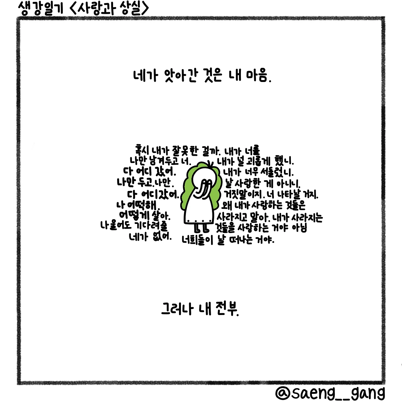 묻고 싶어. 서둘러 날 떠난 이유가 있니. 난 정말 사라질 것을 사랑했던 거니. 내가 널 고통스럽게 한 적 있니. 내 사랑의 결말은 상실이니. 언제까지고 난 너를 잃어야만 하니.