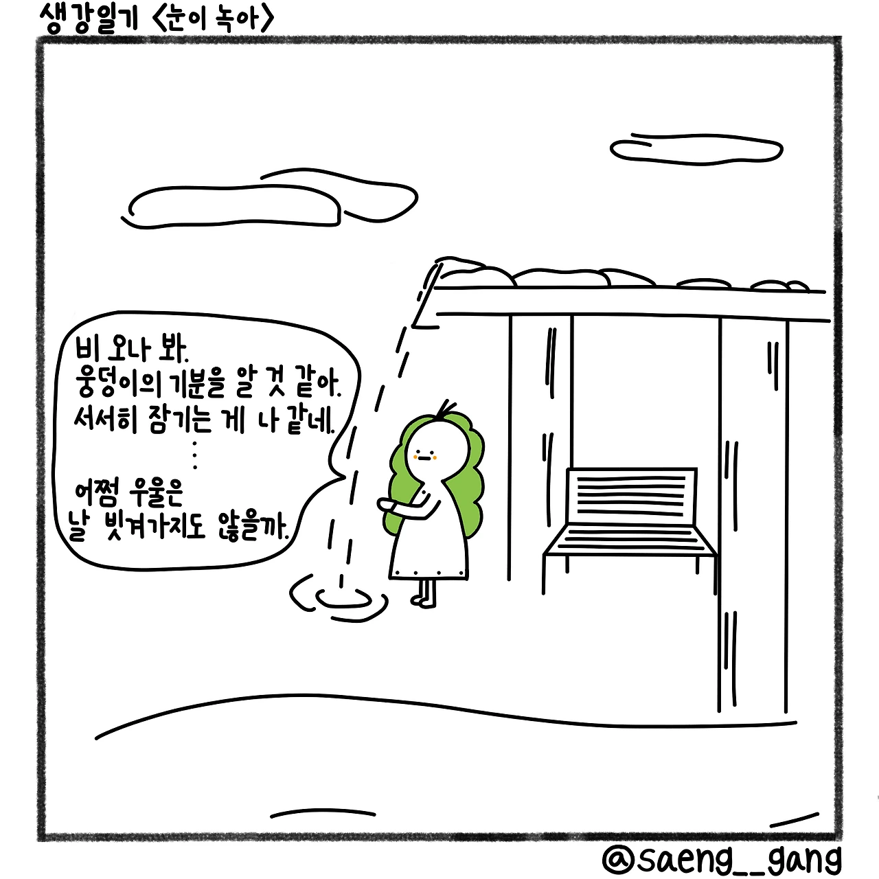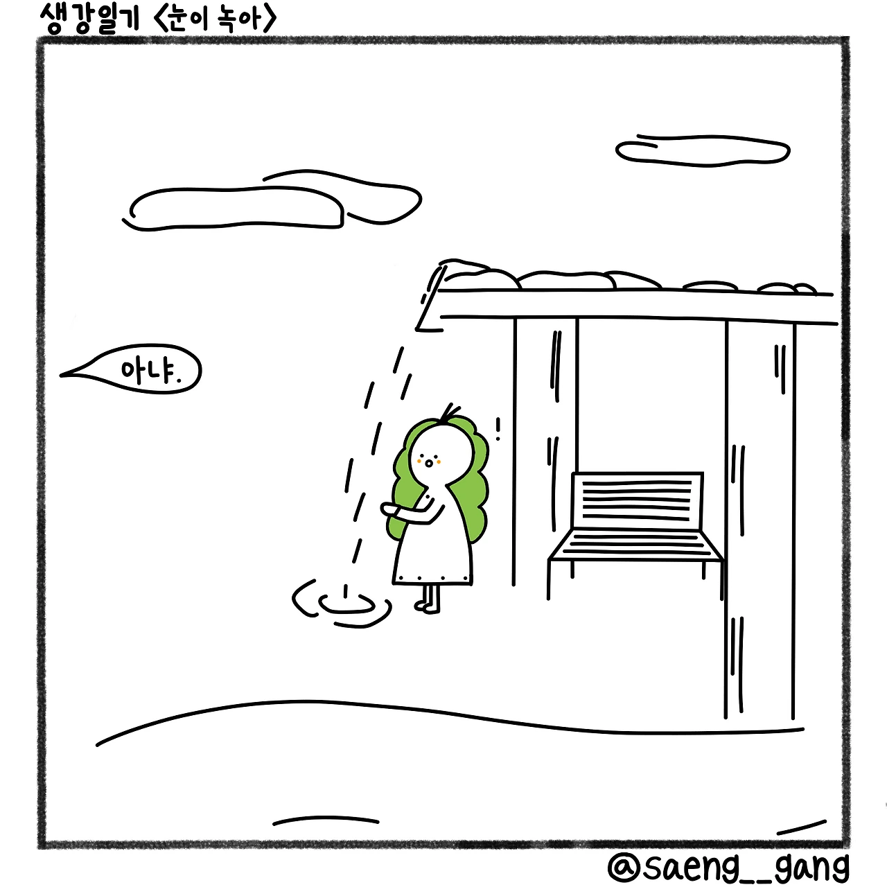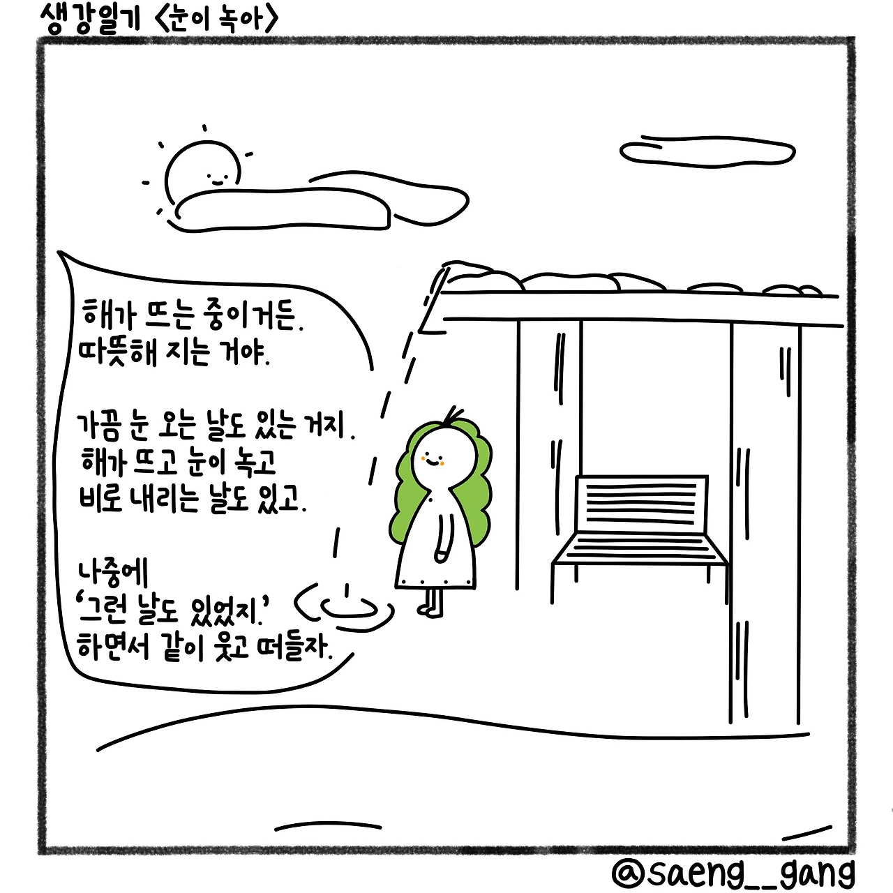 녹아내리는 눈을 보고, 내 머리 위에 쌓인 눈이 햇살에 녹아내리는 것이라 생각해 봤다. 함박눈처럼 고민들이 머리 위로 쌓이면 마음에 찬 기운이 돌아 꽝꽝 얼어버리고, 추운 날을 참고 참다가 발밑에 웅덩이가 생기고, 고개를 들지 않아서 햇살이 나오는 줄도 모르고. 생각의 웅덩이에 발이 잠기면 고개를 들어 햇살이 눈을 녹여 그런 것이라고 생각해 보려 한다.