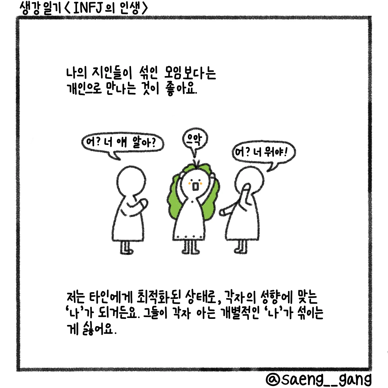 나는 왜 사람들을 대하는 모습이 다 다를까? 왜 저 사람과 있을 때는 말이 많고 이 사람과 있을 땐 조용하지? 나는 정말 모순이구나. 다른 사람들도 그런가? 이런 질문을 끊임없이 해 왔는데, 저는 타인의 성향에 맞춰 분위기를 조성하는 사람이었던 거예요. 이상한 게 아니라 그저 성향이었던 거죠.