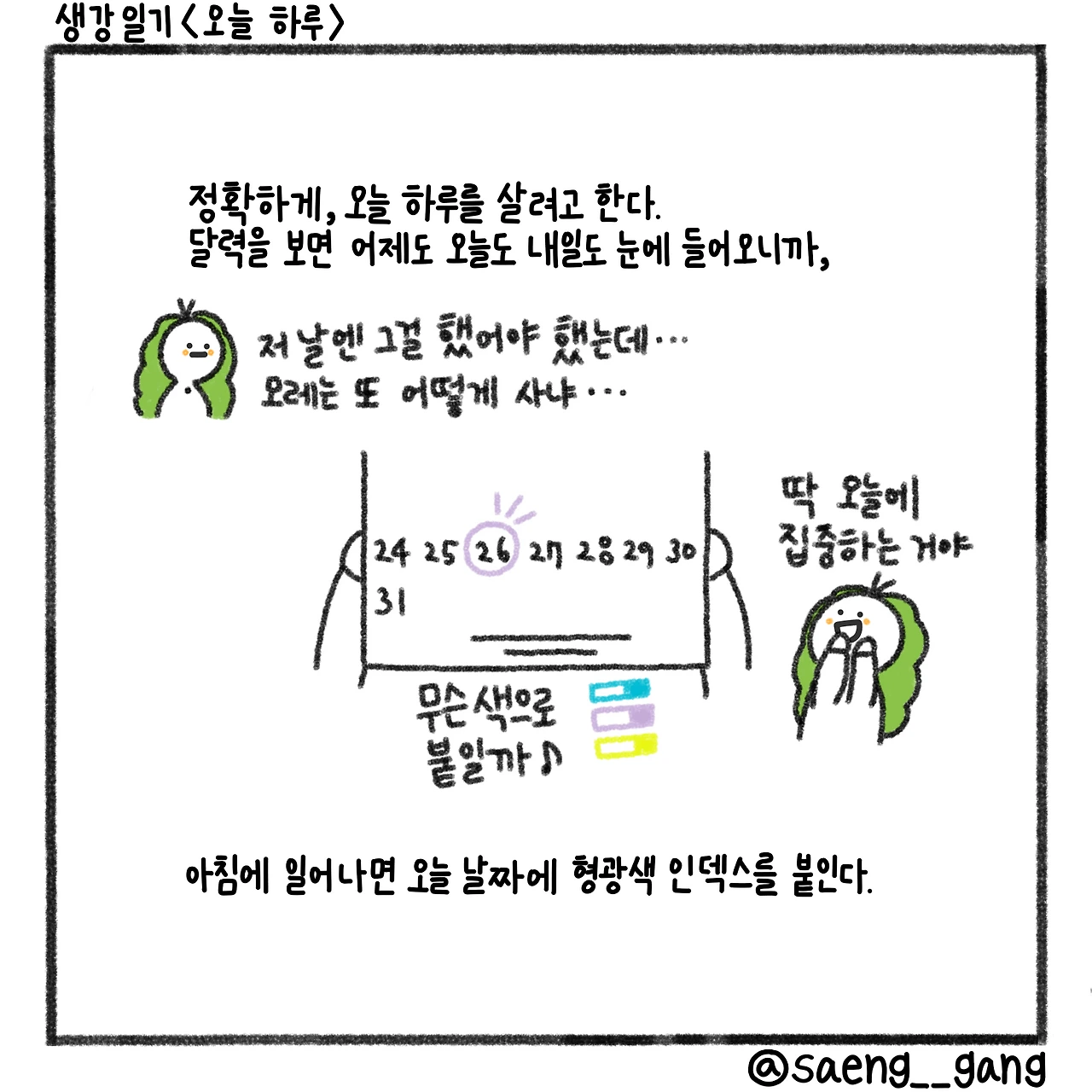 서른 개의 숫자가 적힌 달력을 보고 있으면 머리가 아프다. 저번 주도 보이고 이번 주도 보이고 다음 주도 보인다. 신경 쓰이는 날이 한두 개가 아니다. 오늘을 살고 싶은데 자꾸 어제와 내일을 걱정하고 있다. 나의 하루는 다른 날들을 걱정하다가 지나간다. 그것이 매일 반복되니 과거와 미래에 매달리게 됐다. 오늘은 오늘뿐인데, 다시 돌아오지 않는 날인데, 나는 지나간 날과 오지 않은 날을 걱정한다.