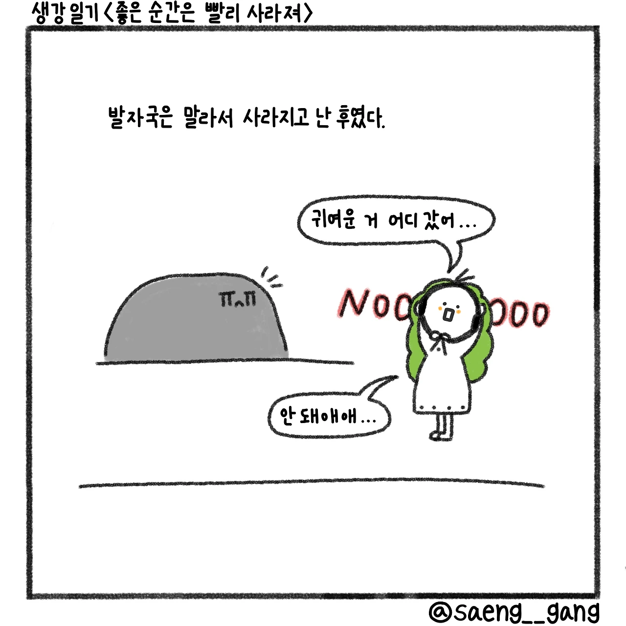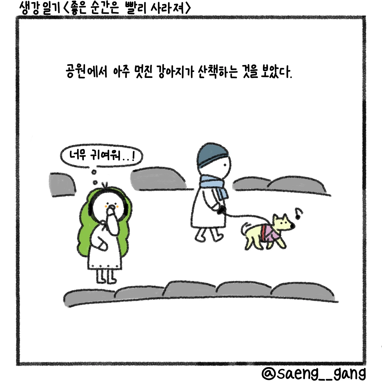 귀엽다, 귀여워, 하며 속으로 외치던 나는 강아지의 발자국을 보는 사람들 사이로 들어갈 자신이 없어서 자연스럽게 공원을 한 바퀴 더 돌기로 결심했다. 돌고 와서 귀여운 발자국을 혼자 감상해야지. 그런 마음으로 빠르게 걸었다.