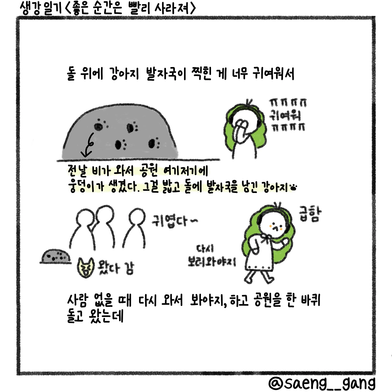 기세 좋은 걸음으로 공원을 누비던 강아지를 봤다. 이전에 비가 와서 물웅덩이가 생겼고 그걸 밟은 강아지가 돌 위에 올라갔다. 그의 귀여운 발자국은 그렇게 탄생했다.