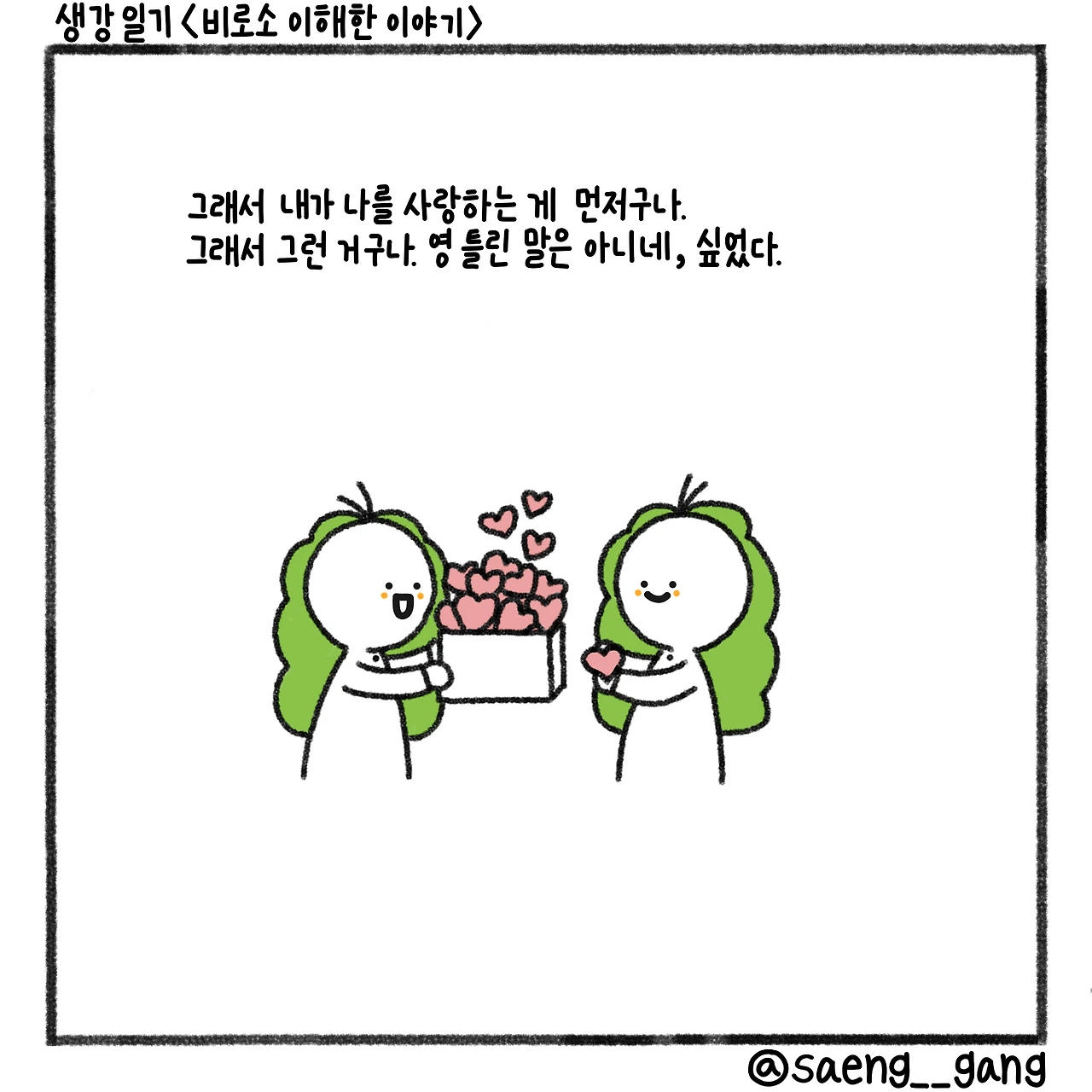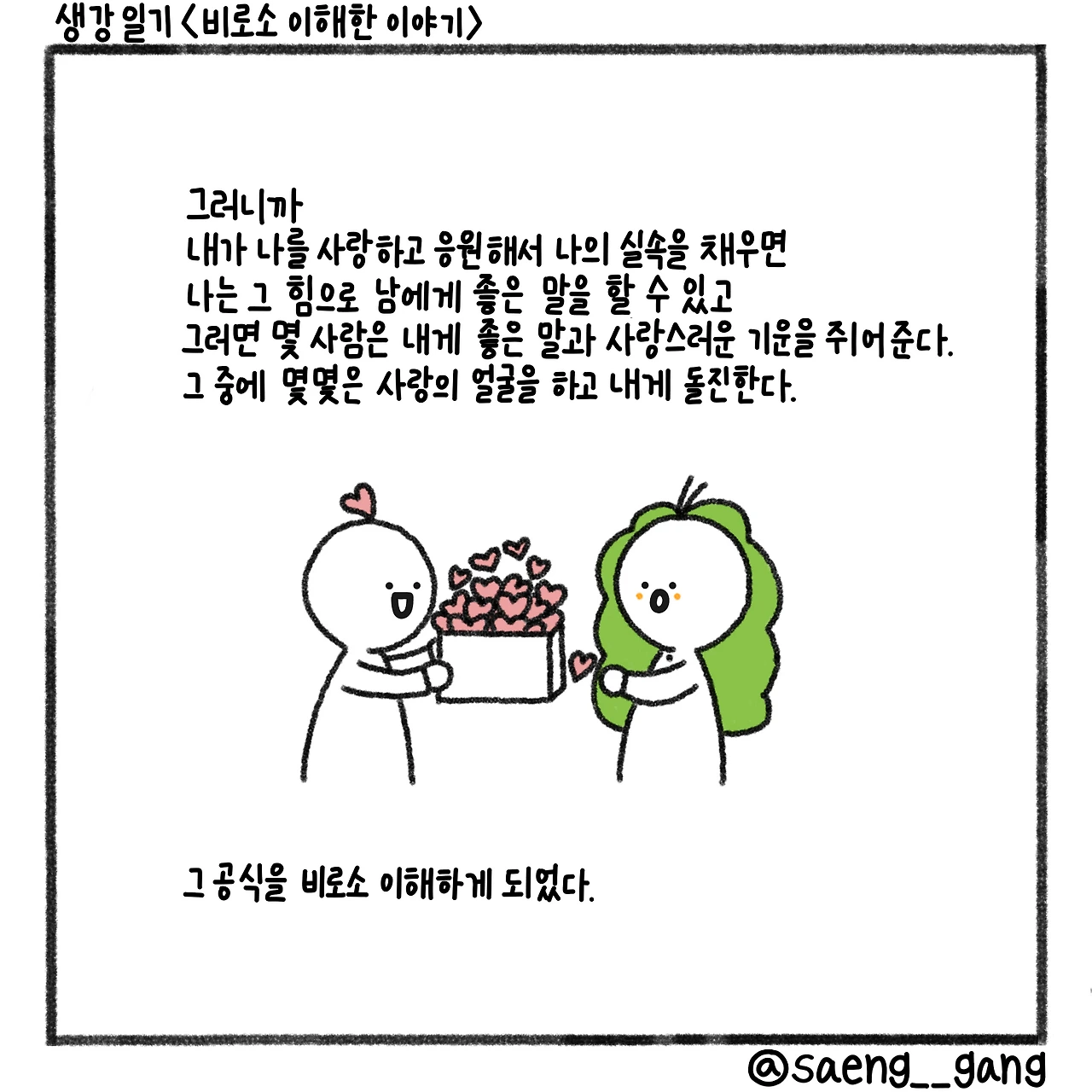 문장의 의미를 하나씩 쪼개 보았다. 내가 나를 사랑하는 것, 그러니까 스스로를 응원하고 좋은 말을 퍼 나르고 좋은 기운을 온몸에 묻히면 나는 나대로 실속이 꽉 찬 사람이 된다. 힘이 찬다. 그 힘으로 남을 만나고 더 상냥하게 굴고 다정한 말을 뱉으면 상대방도 좋은 기운을 얻는다. 그중에 몇몇은 내가 준 기운을 소화시켜 다시 나에게 사랑스러운 말로 갚는다. 완벽한 사랑의 얼굴을 하고 내게 돌진한다.
