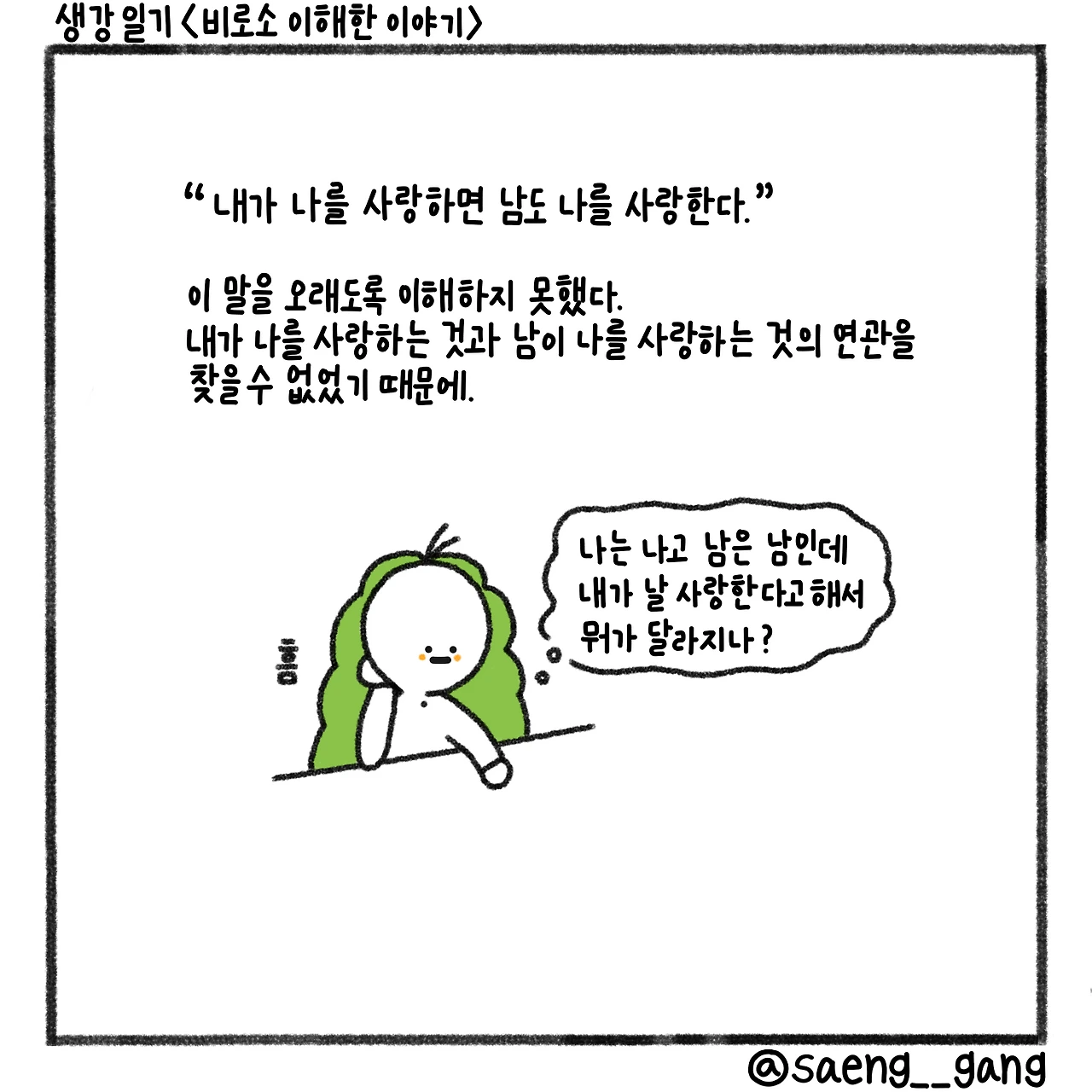 내가 나를 사랑한다 한들 남이 나를 사랑할까. 그건 취향의 문제 아닌가? 내가 나를 사랑해도 남이 나를 사랑하지 않을 수 있는 거잖아. 내가 나를 사랑하지 않아도 남이 나를 사랑할 수 있는 거 아닌가.