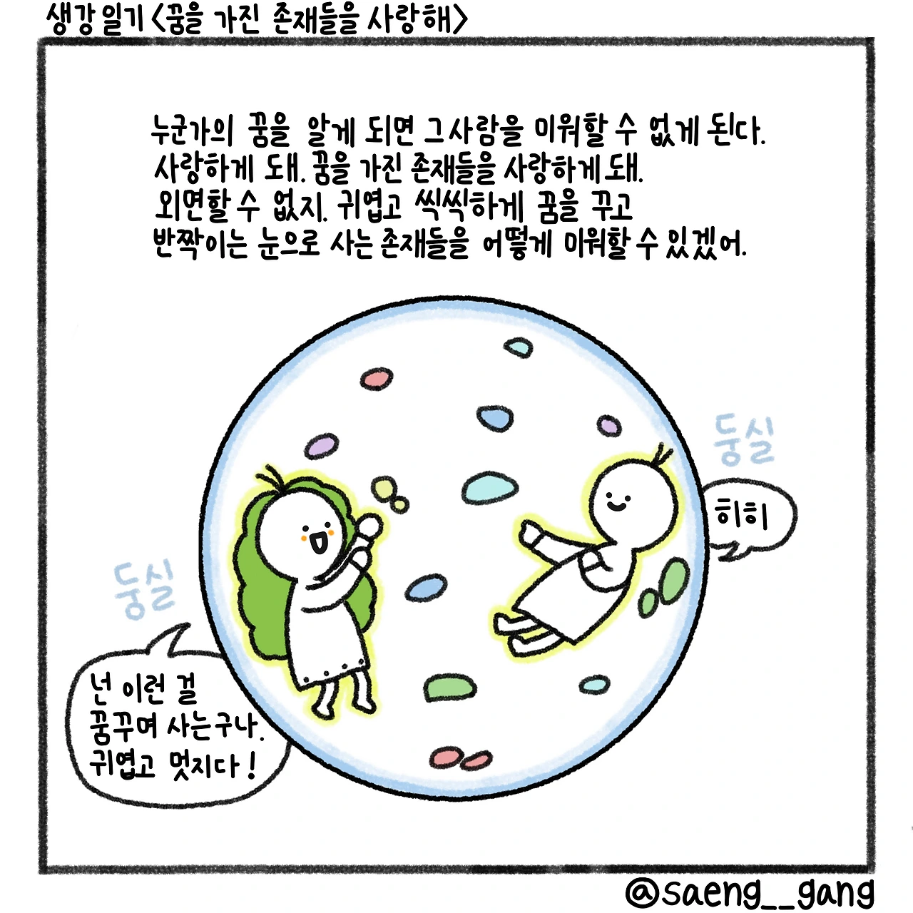 꿈꾸는 존재들은 너무나 사랑스럽고 귀여워. 꿈에 대한 이야기를 들을 때면 나는 당신의 우주 속으로 빨려 들어가지.