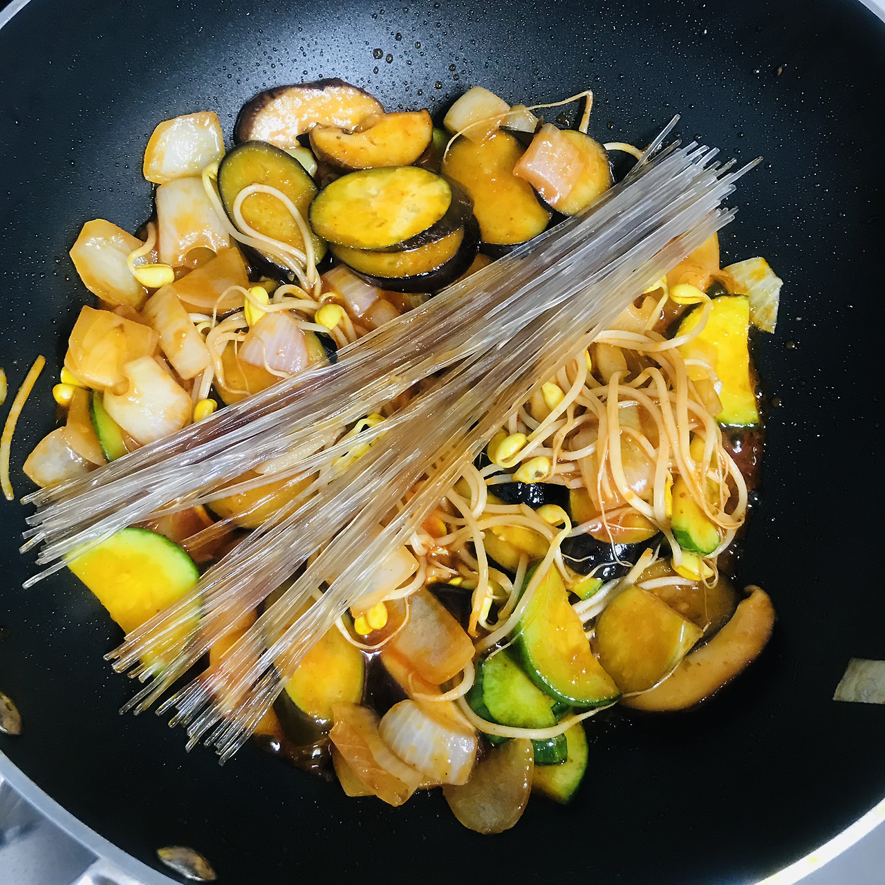 3. 불린 당면(또는 두부면)을 넣고 볶는다.