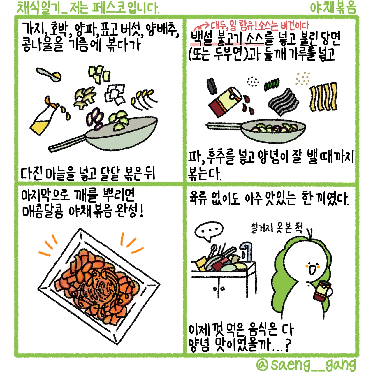 내가 만든 야채볶음은 아주 맛있었다. 당면은 쫄깃했고 양념이 밴 야채의 매콤 달콤함이 입안에 퍼졌다. 밥 한 그릇을 뚝뚝 해치웠다. 육류 없이 맛있는 한 끼를 먹었다.