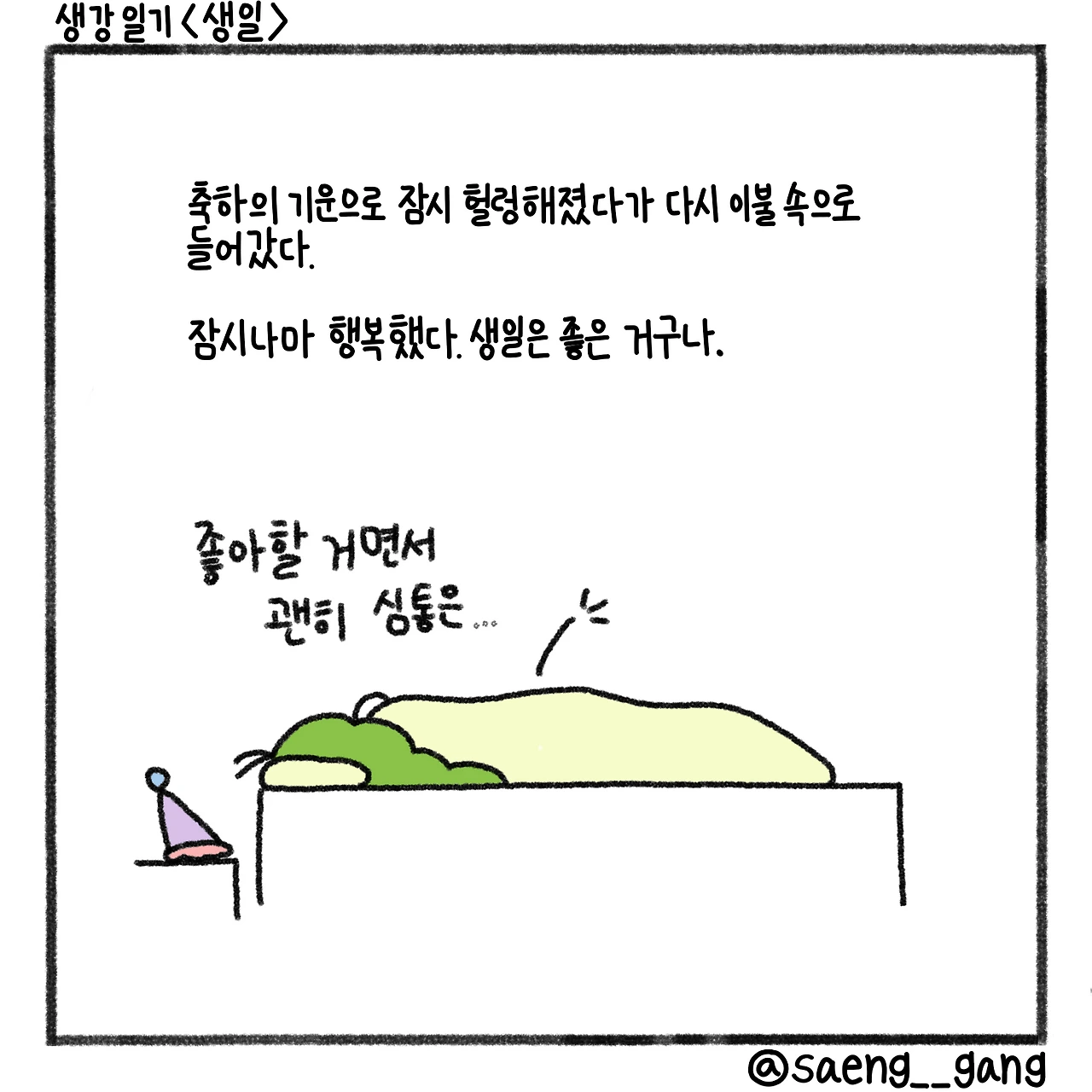 헐렁하고 물렁해진 마음을 안고 이불속으로 들어갔다. 생일은 좋은 거구나. 좋아할 거면서 올해도 심통 부리는 건 여전하구나.