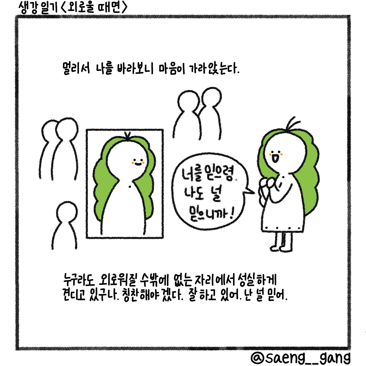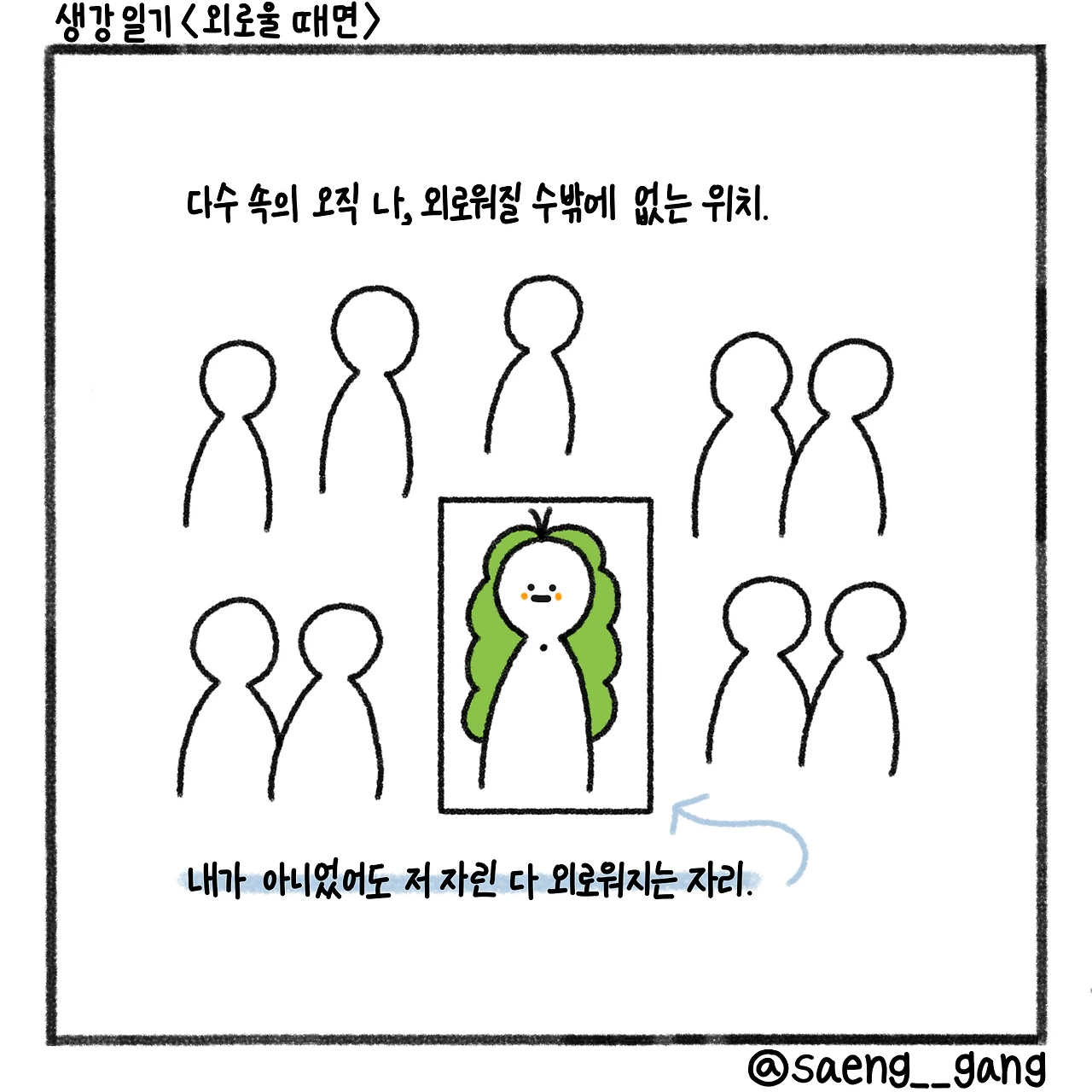 다수 속에서 홀로 무언가를 하는 일. 타인의 응원이나 관심 없이 묵묵히 사는 일. 내가 아니었어도 누구나 외로워질 자리다. 나는 그 자리에 있을 뿐, 나 스스로가 이상하거나 손가락질받을 사람은 아니었음을 깨닫는다. 그저 그 상황에 놓였고, 그저 그 자리에 있었을 뿐. 그런 생각을 하니 나를 멀리서 바라볼 수 있었다. 초조한 나를 다독이는 또 다른 내가 될 수 있었다.