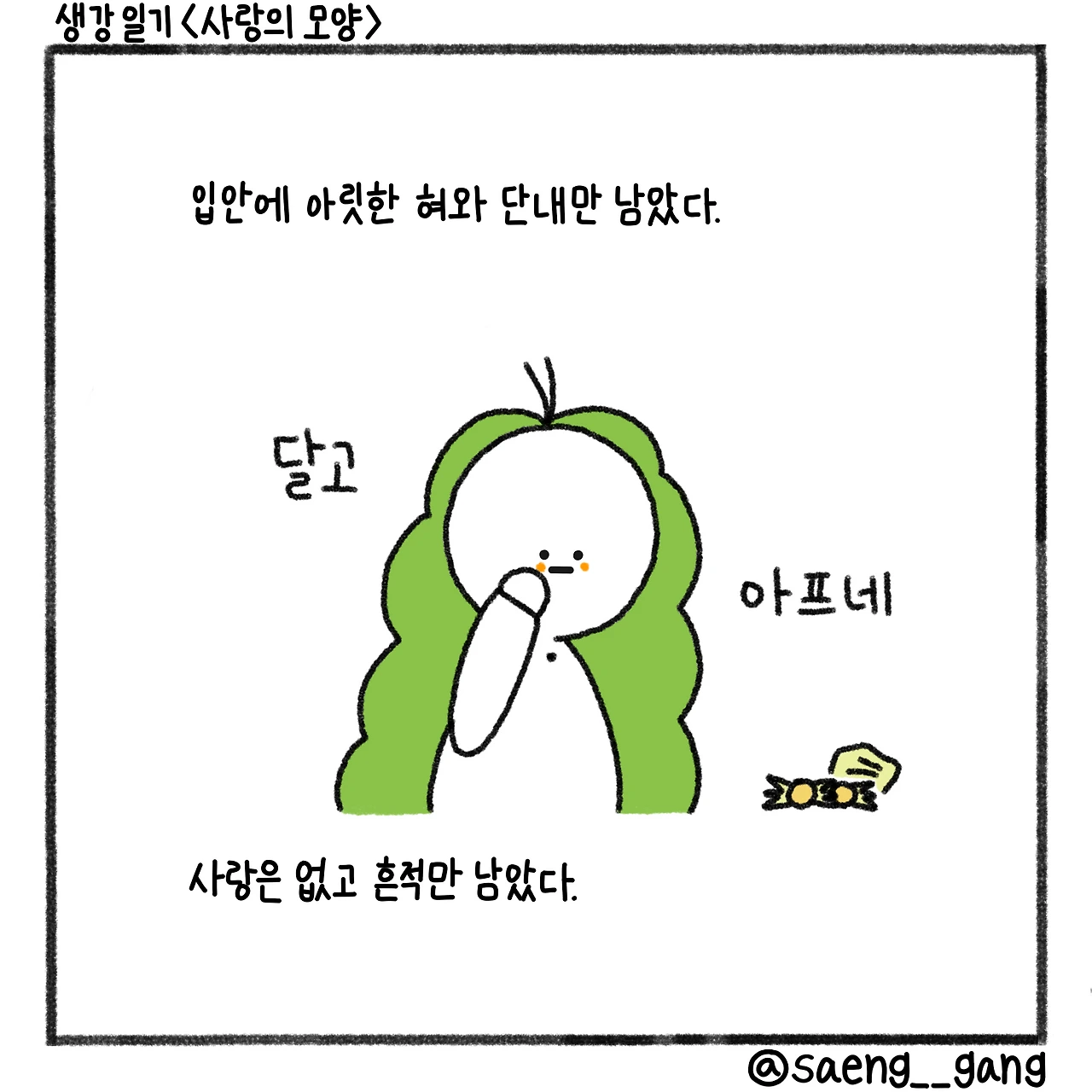 사랑은 사탕처럼 예상치 못한 곳이 녹고, 알 수 없는 곳에 뾰족함이 생겨 사람을 찌르는 모양을 가졌다. 사랑의 모양을 생각하다가 사탕을 다 먹었다. 녹아서 사라졌다. 단내만 남고 사라졌다. 사랑의 끝도 그것과 비슷하다는 생각을 한다.