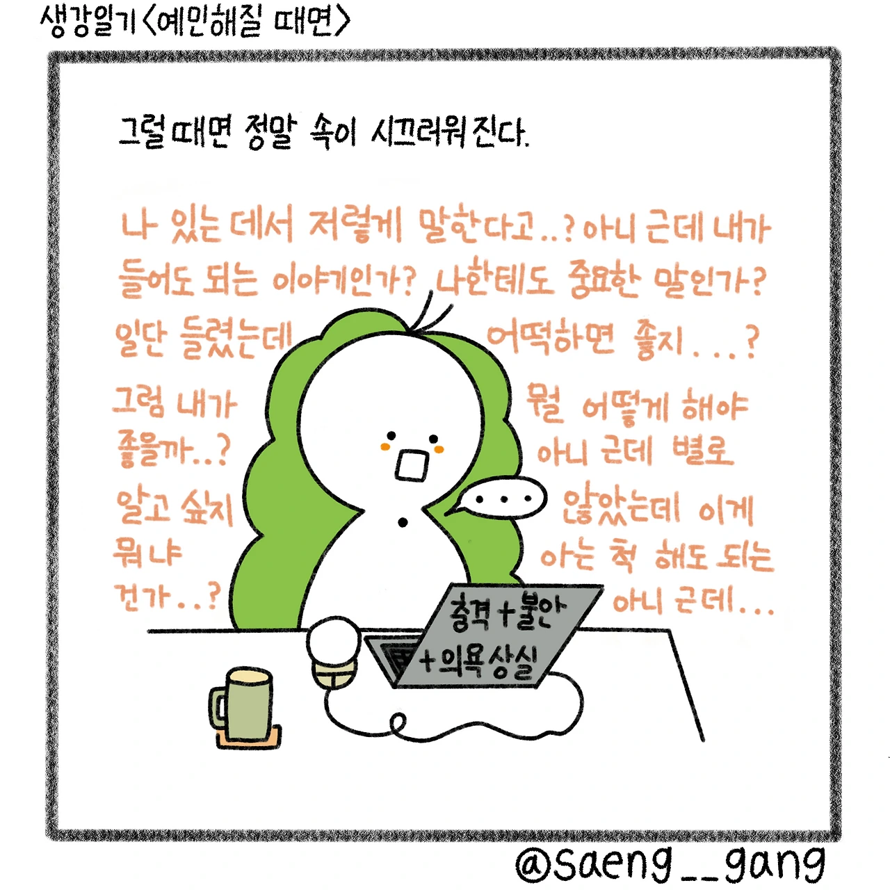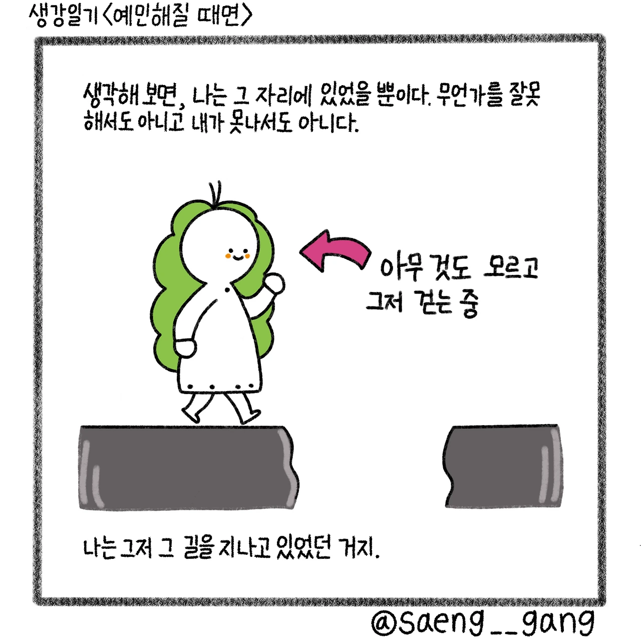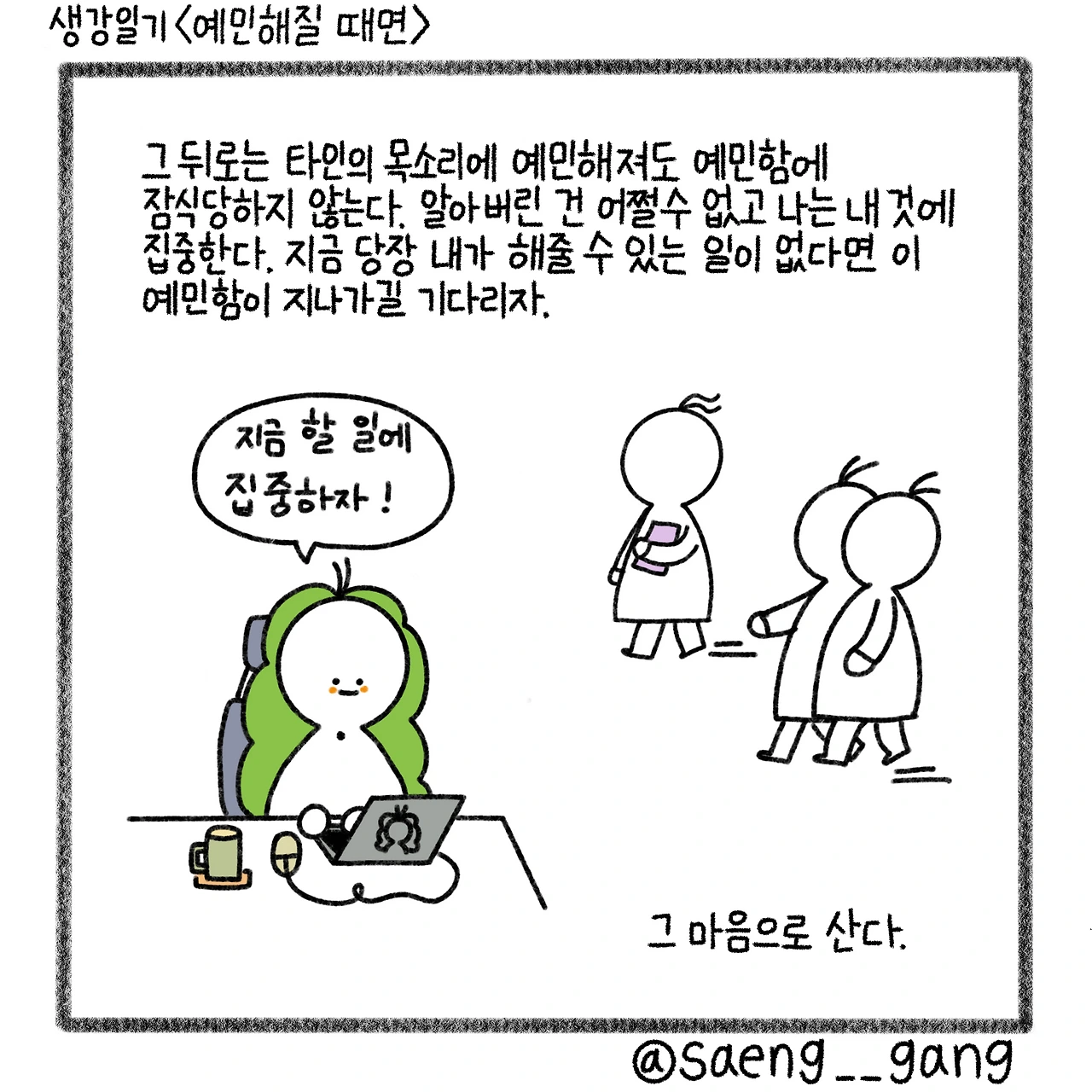 그 뒤로는 스스로의 예민함에 잠식당하지 않도록 노력한다. 이 예민함도 곧 지나갈 것이라고 믿는다. 충격이나 불안을 흘려보내는 방식으로 순간을 지난다. 지금 내가 하던 일에 집중하고 사람의 목소리를 흘려보낸다.