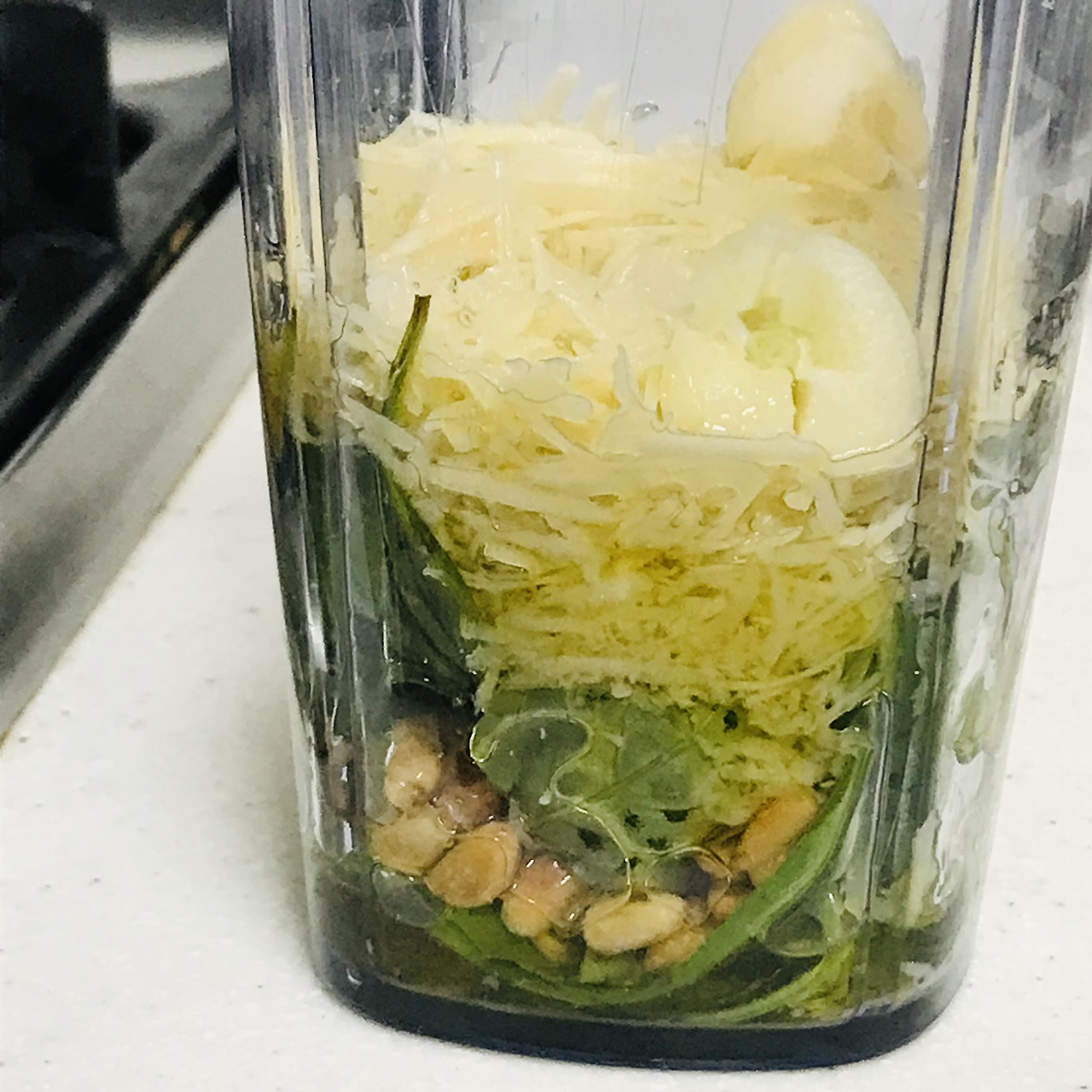 바질 한 주먹 / 잣 반 주먹 / 파마산 치즈(저는 비건 치즈를 사용했습니다) / 레몬즙 / 후추 / 올리브 오일 / 마늘 1개