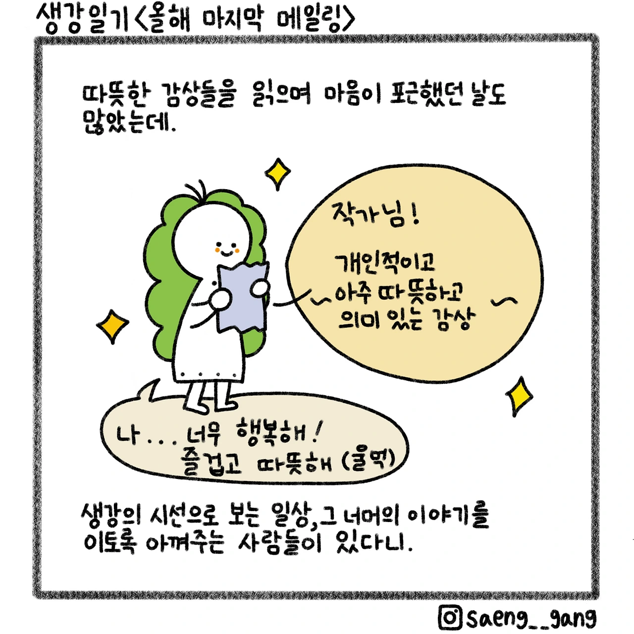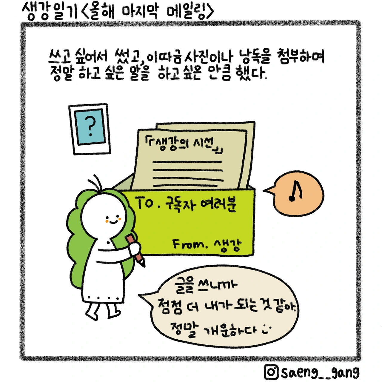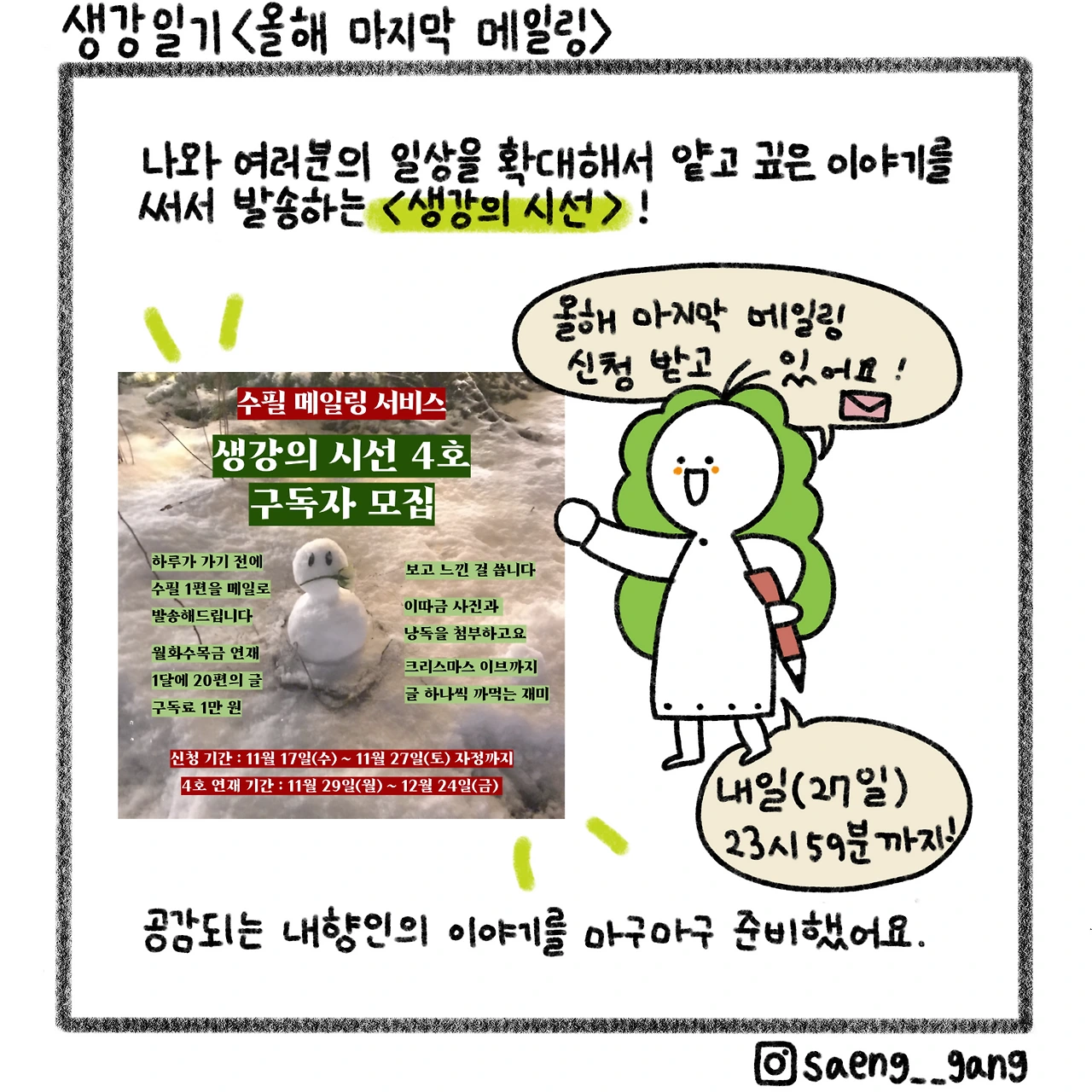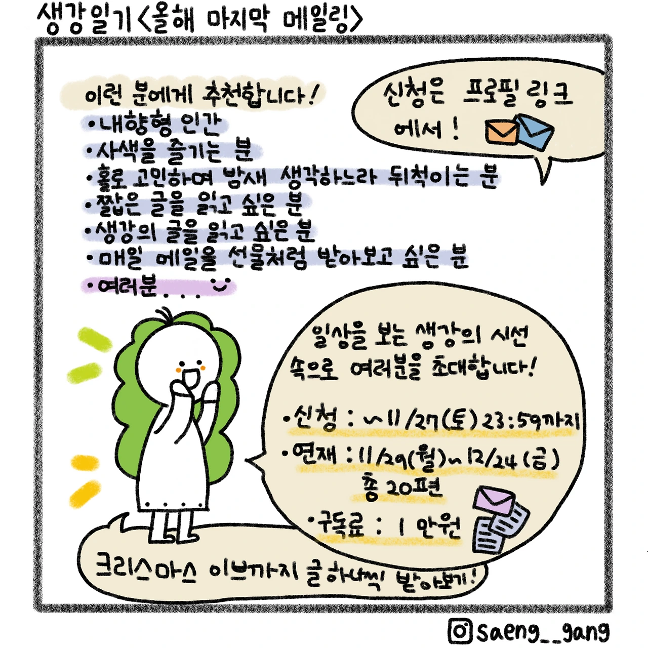 생강의 시선을 통과한 일상 이야기를 보고 싶다면, 수필 메일링 서비스 <생강의 시선>을 구독하세요! 크리스마스 이브까지 글 하나씩 까 먹는 재미가 있답니다. 이따금 사진이나 낭독을 덧붙여요. 저 발음이 좋거든요.