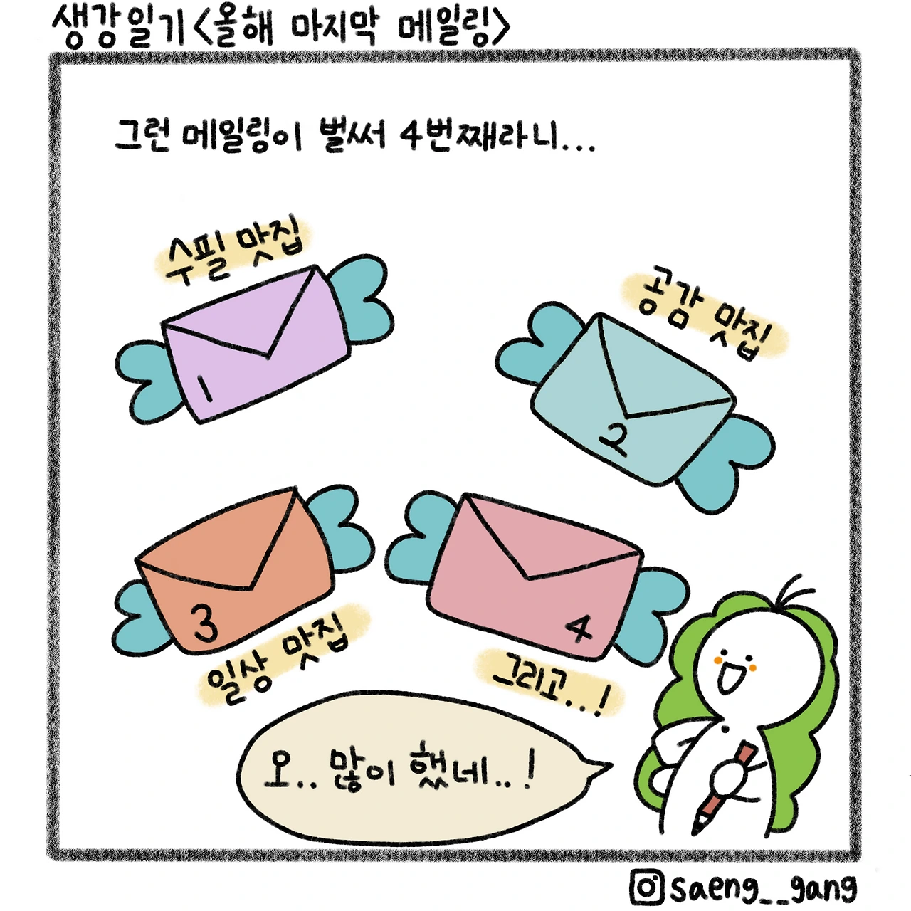 그림일기에서 다 하지 못한 말들을 수필로 적는다. 그것을 메일로 보내고 나와 당신은 1달에 20번 맞닿는다. 매일 메일을 받는 재미와 매일 쓰는 재미가 맞닿을 때, 우리는 우리만의 시공간에서 만난다. 멀리서 서로를 보듬는 방식으로.