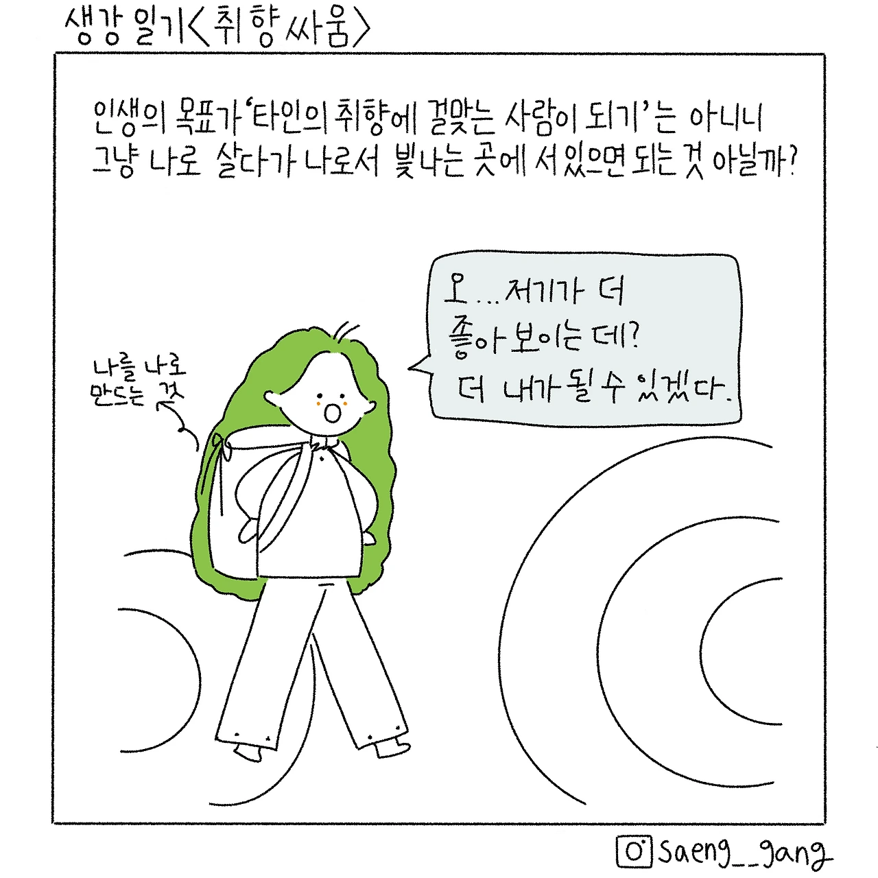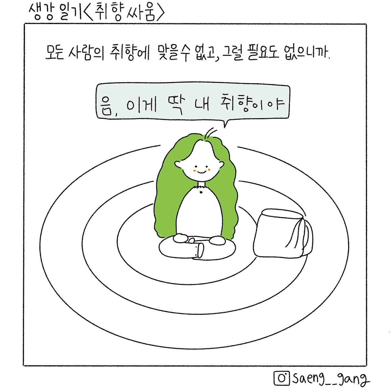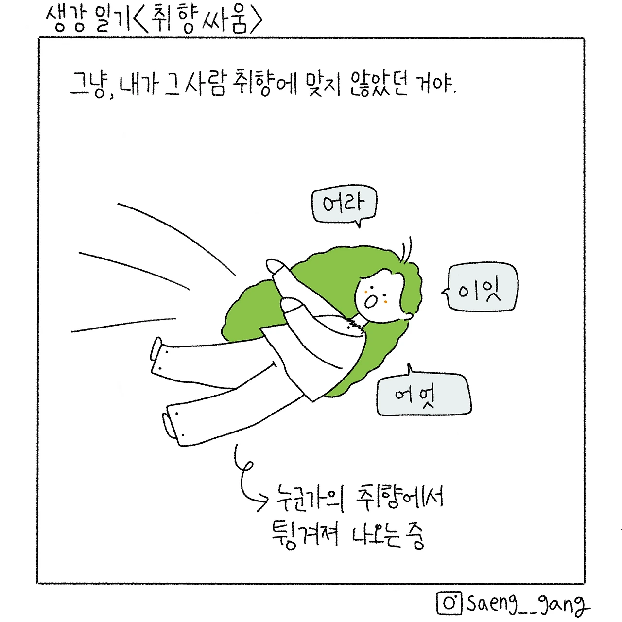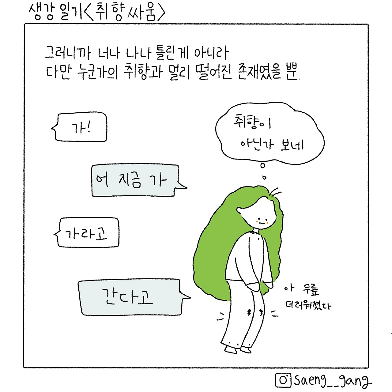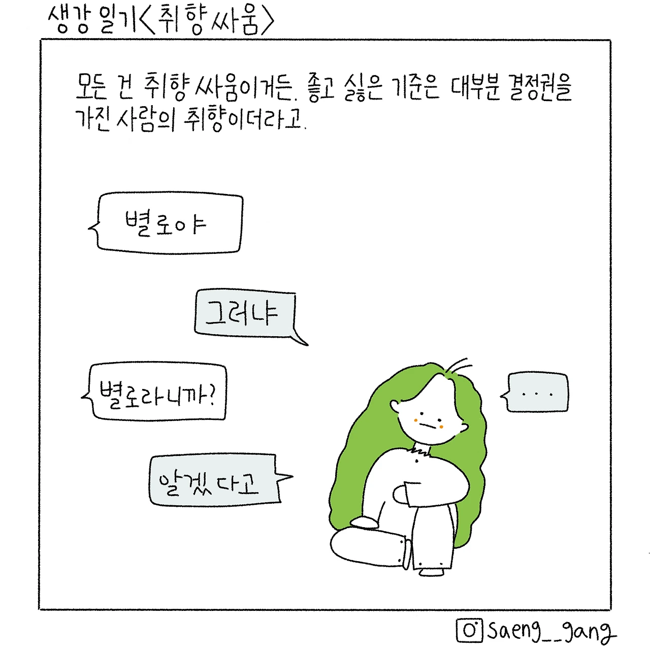 그게 내 취향이니까. 내가 틀린 게 아니고 취향이 부딪힌 거라고. 너와 나는 나와 나로 존재하므로 다를 수밖에 없다고 생각하면 마음이 편해진다.
