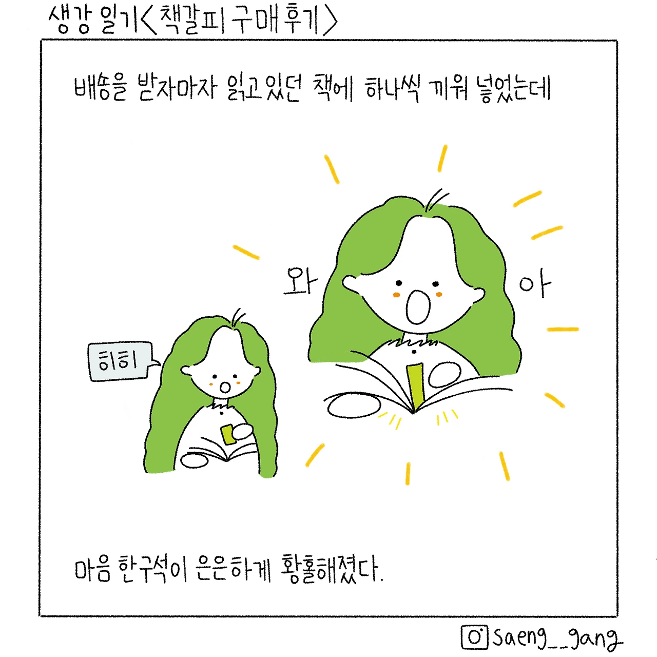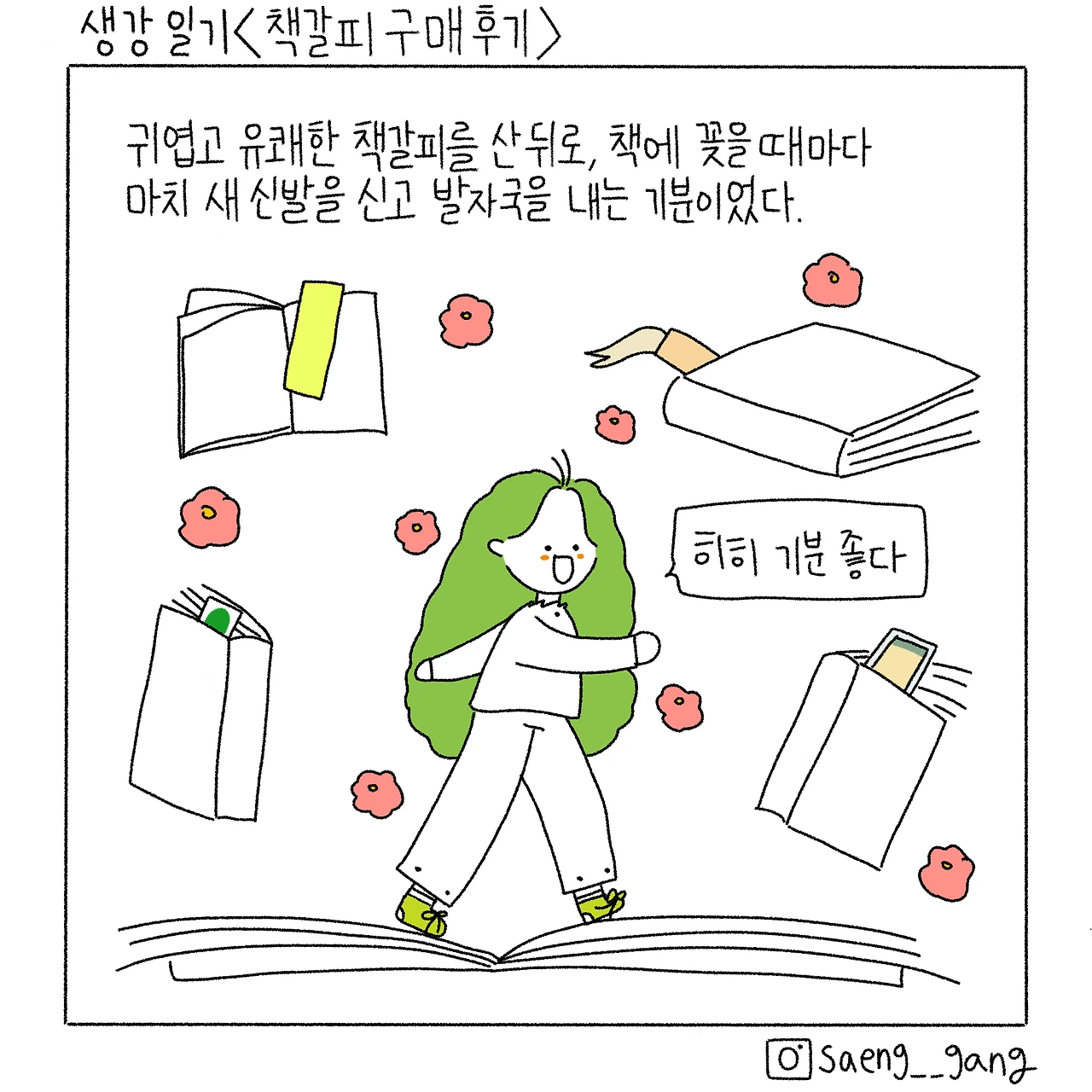 휴지든 종이든 영수증이든 잡히는 대로 꽂던 시절엔 나의 책 발걸음이 덤덤했다면, 책갈피를 산 이후로 나의 책 발걸음은 새 신발을 신고 폴짝 뛰어다니는 모양새야. 아주 신났지. 책갈피를 한 번이라도 더 보려고 책을 펼치기도 하니까.