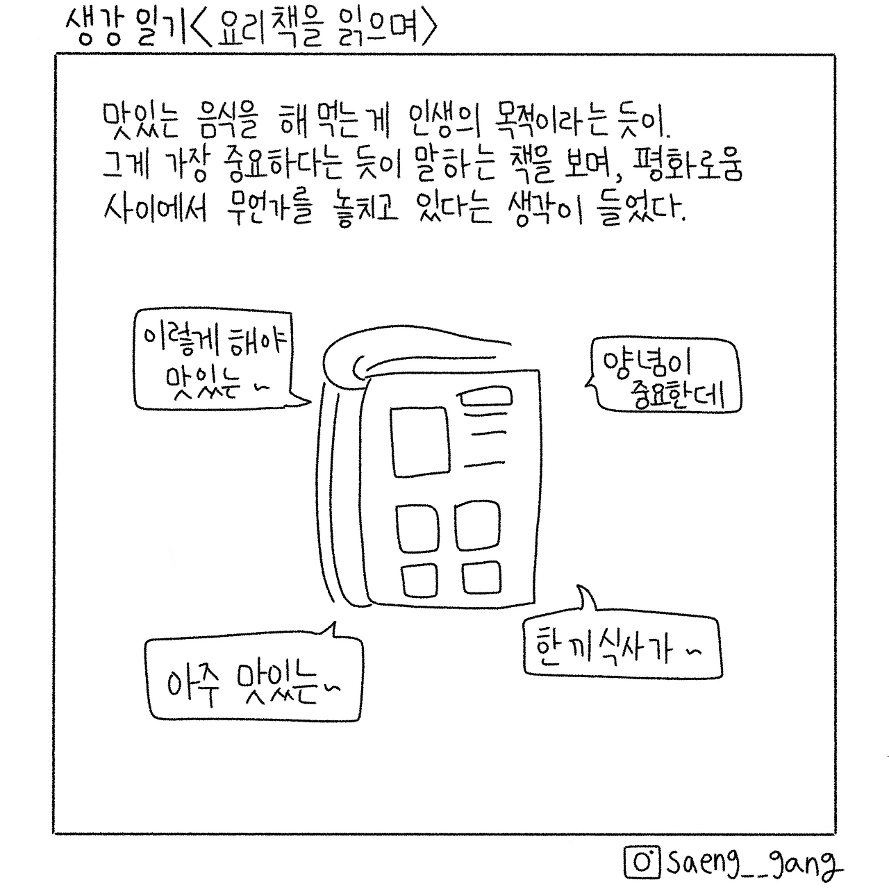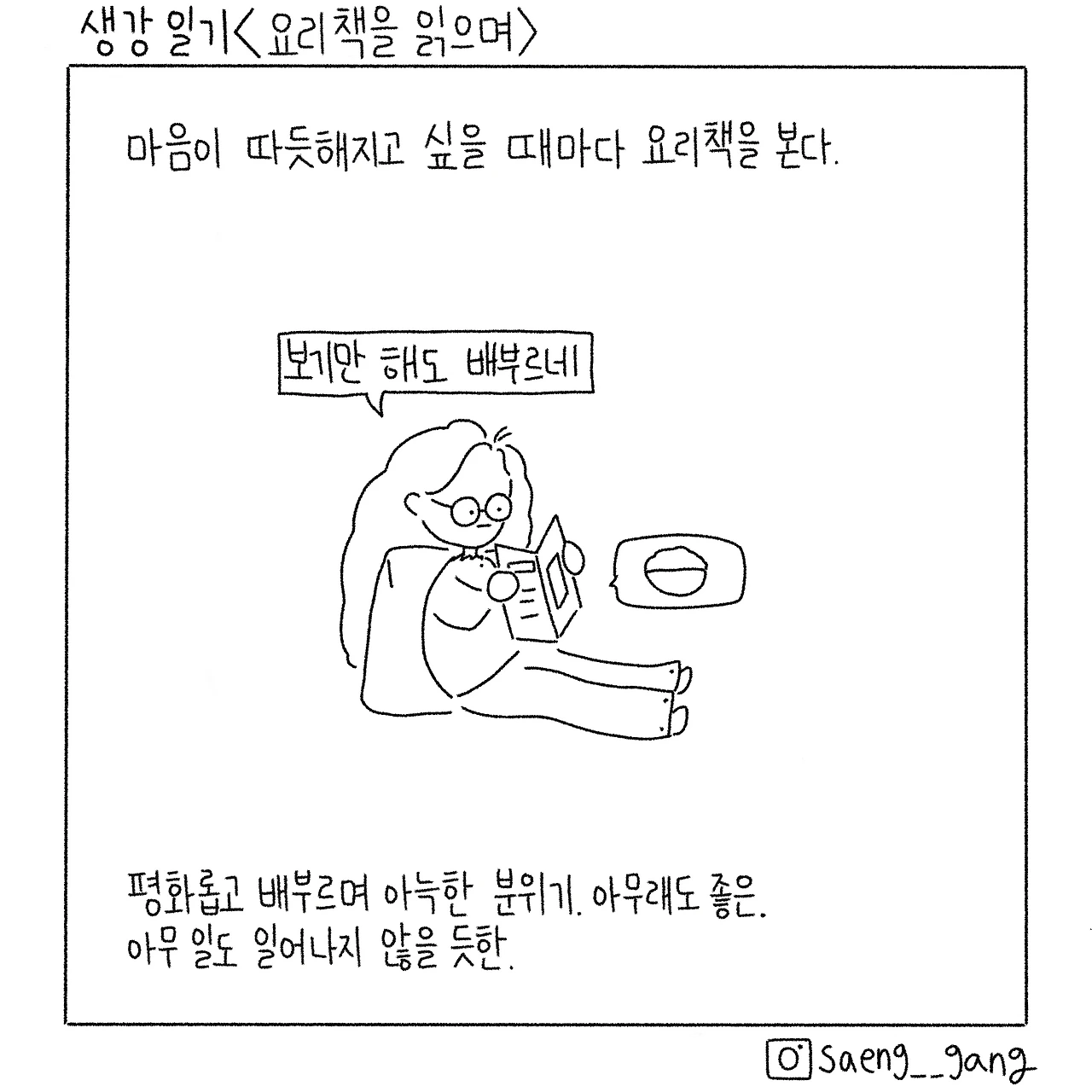 나는 아무 일도 일어나지 않는 게 좋다. 평화롭고 안전한 분위기가 정말 좋아. 불안할 것 없고 따듯한 분위기가. 요리책이 그랬다. 사건도 없고 사고도 없는 평화로운 요리법만이 가득한.