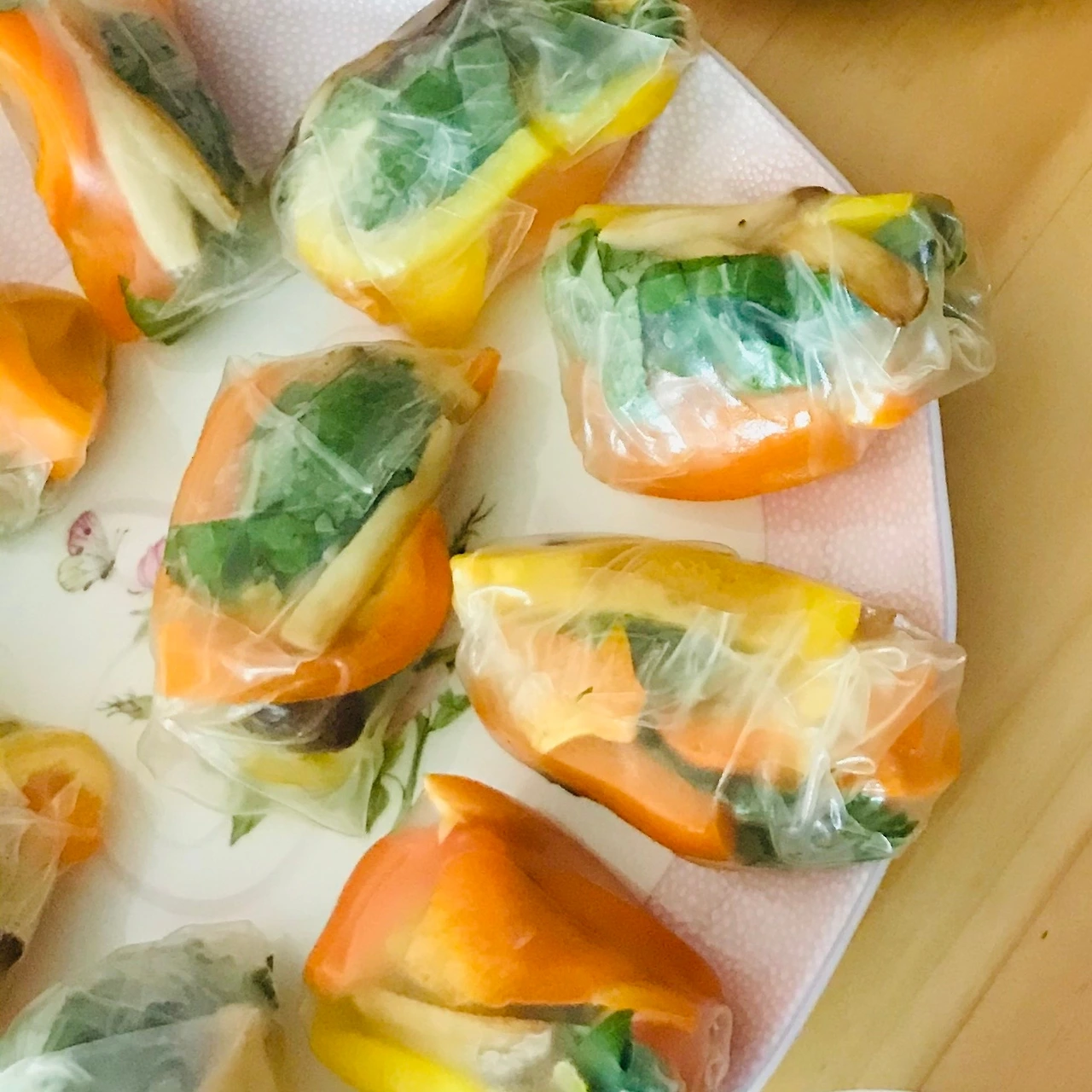 양상추 한 줌 / 파프리카 반 개 / 버섯 (새송이는 1개, 표고는 2~3개) / 언리미트 콩고기 / 당근 4/1개 / 오이 2/1개 / 라이스페이퍼 / 칠리소스