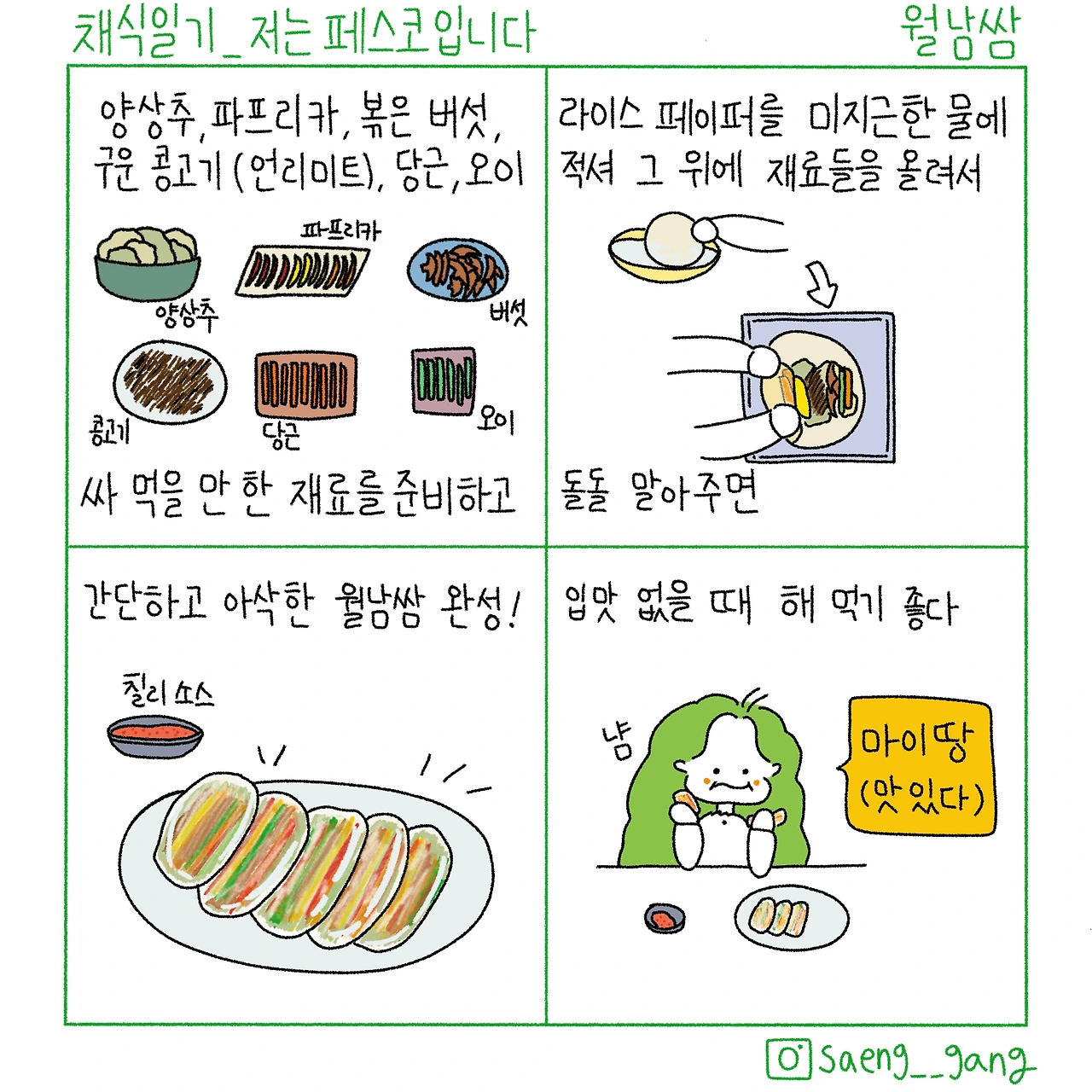 간단하지만 아삭하고 쫄깃한 월남쌈. 냉장고에 남은 채소를 모아서 먹기 좋은 요리다. 재료는 매번 바뀌는데 어느 날은 언리미트 콩고기를 넣어 월남쌈을 먹었다. 식감도 좋고 다른 채소와 궁합도 좋았다.