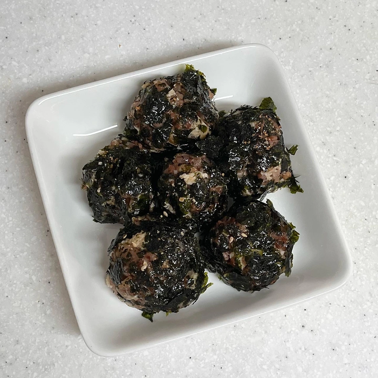 4. 밥을 동그랗게 말아 김가루에 굴리면 식물성 참치 주먹밥 완성!