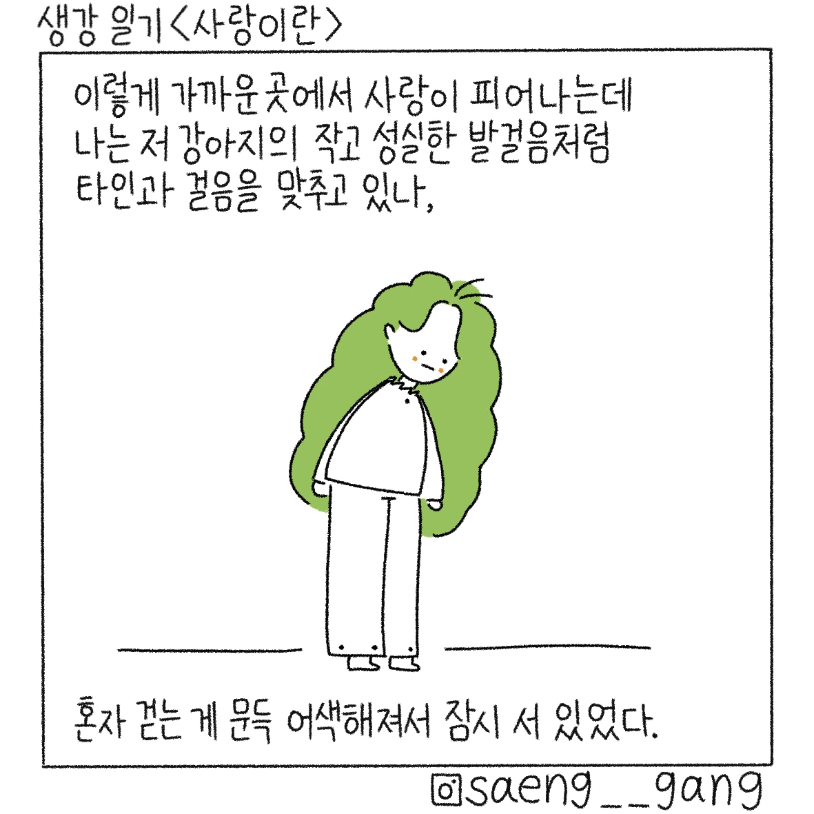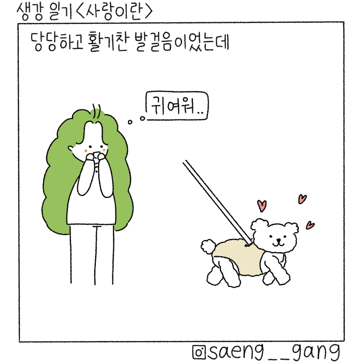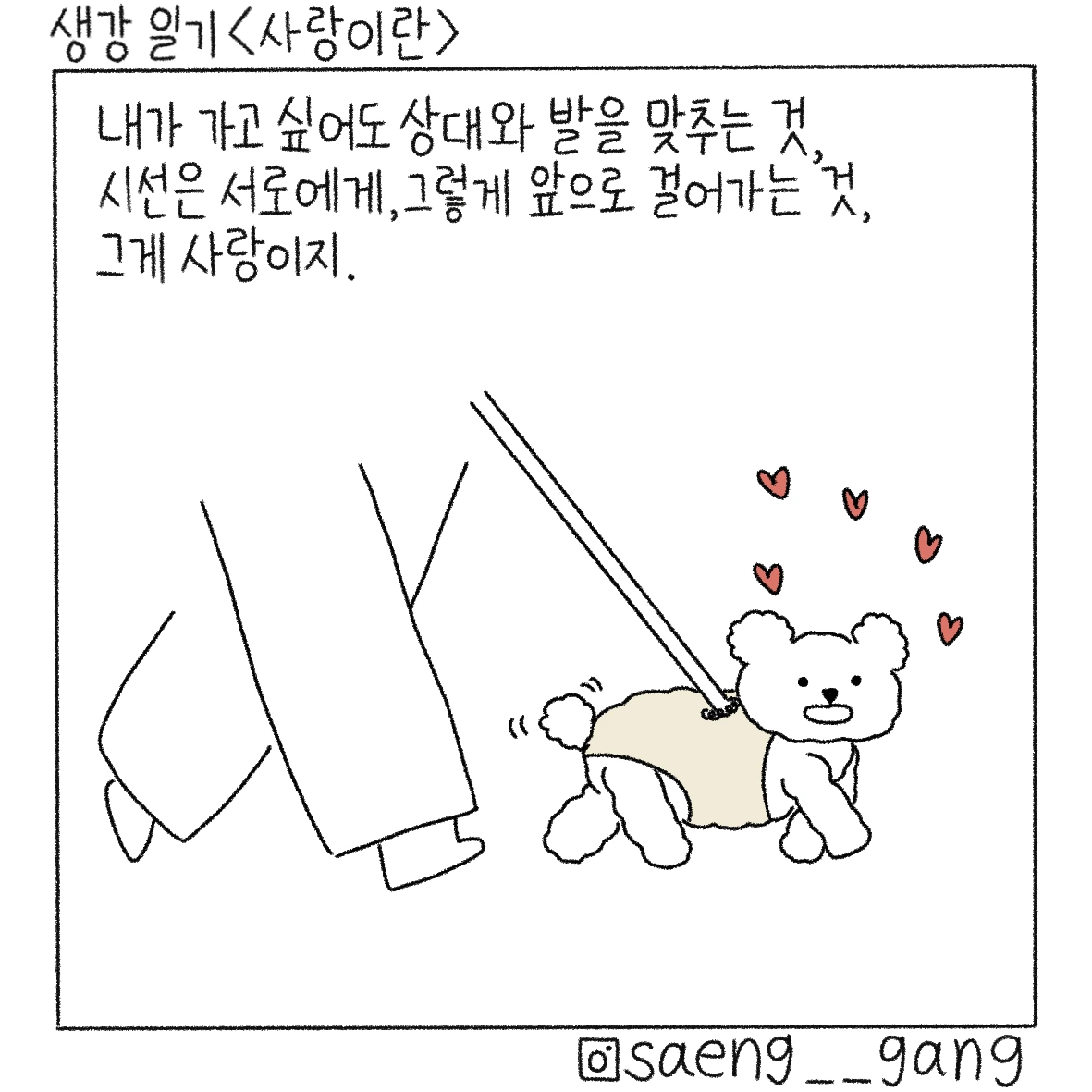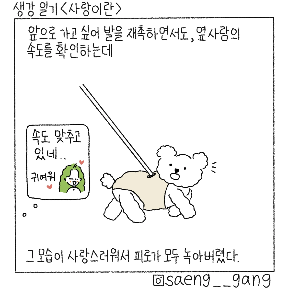 산책의 묘미는 동네 강아지들을 구경할 수 있다는 것, 그날도 어김없이 강아지들을 만났는데 하얀 털을 가진 작은 강아지가 열심히 발을 구르며 산책을 하고 있었다. 아주 신나 보였고 견주의 발걸음도 가벼웠고 즐거움을 주체할 수 없다는 듯 명랑하게 뛰는 강아지를 보며 입을 꾹 누르고 실실 웃었다.