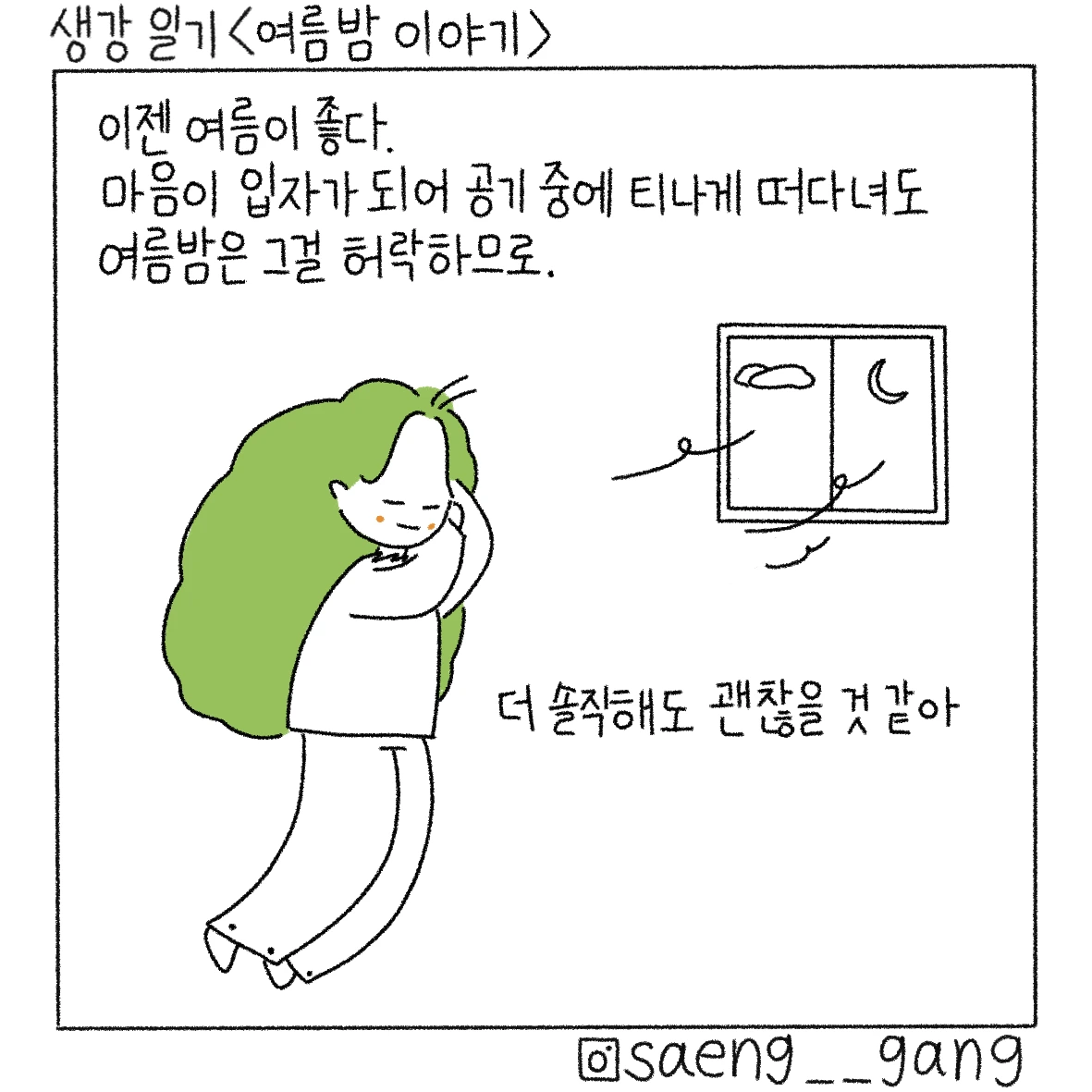 여름밤 냄새가 풍겨서 이 문장을 적었다. 나는 여름을 좋아하지 않는데, 여름밤만 되면 아주 솔직해지고 깊은 말을 꺼내며 비로소 내가 되는 기분에 휩싸인다는 사실을 깨달았다.