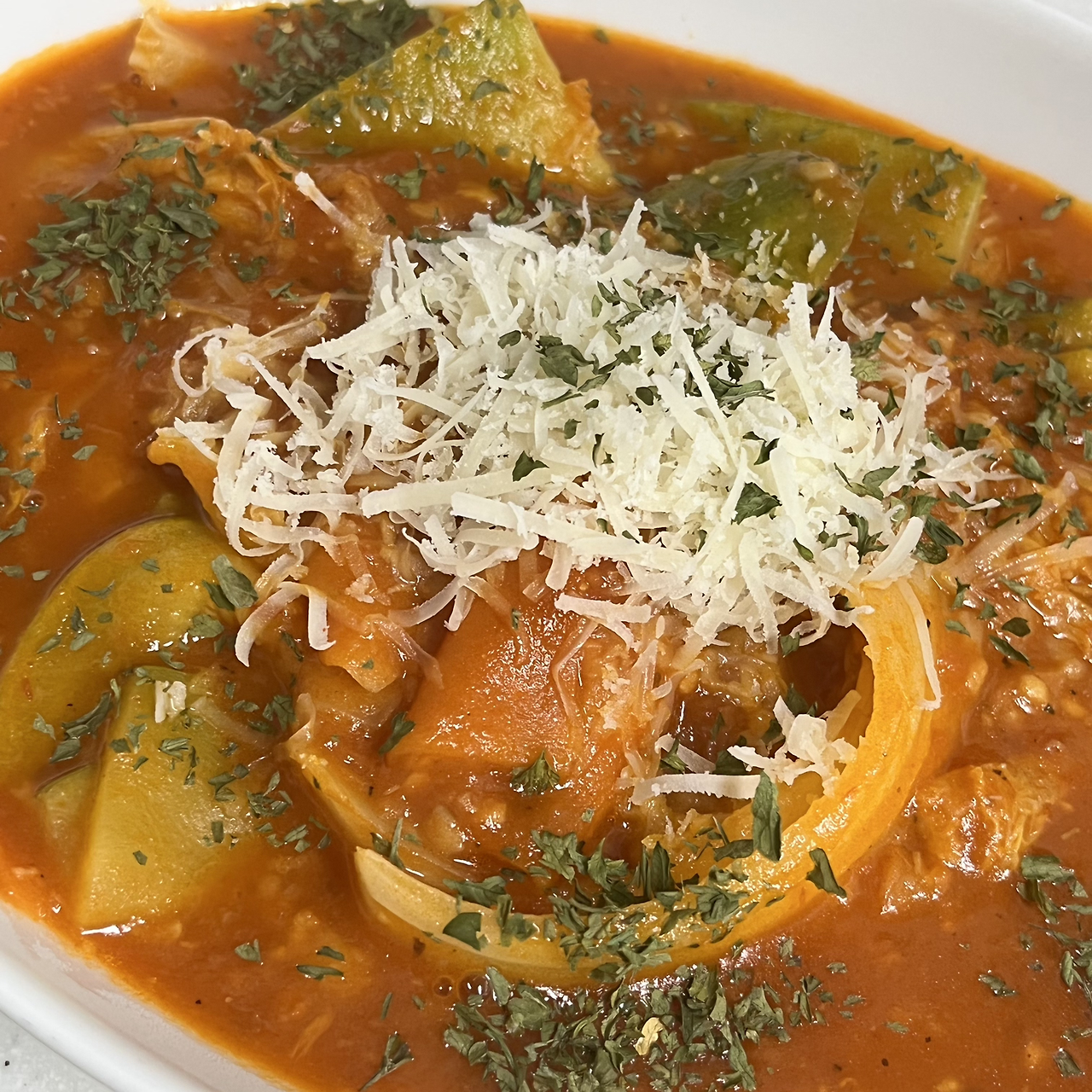 애호박 1/4, 당근 1/5, 알배추 4~5장, 비건 토마토소스, 올리브유, 다진 마늘, 소금, 후추, 비건 치즈, 파슬리, 물
