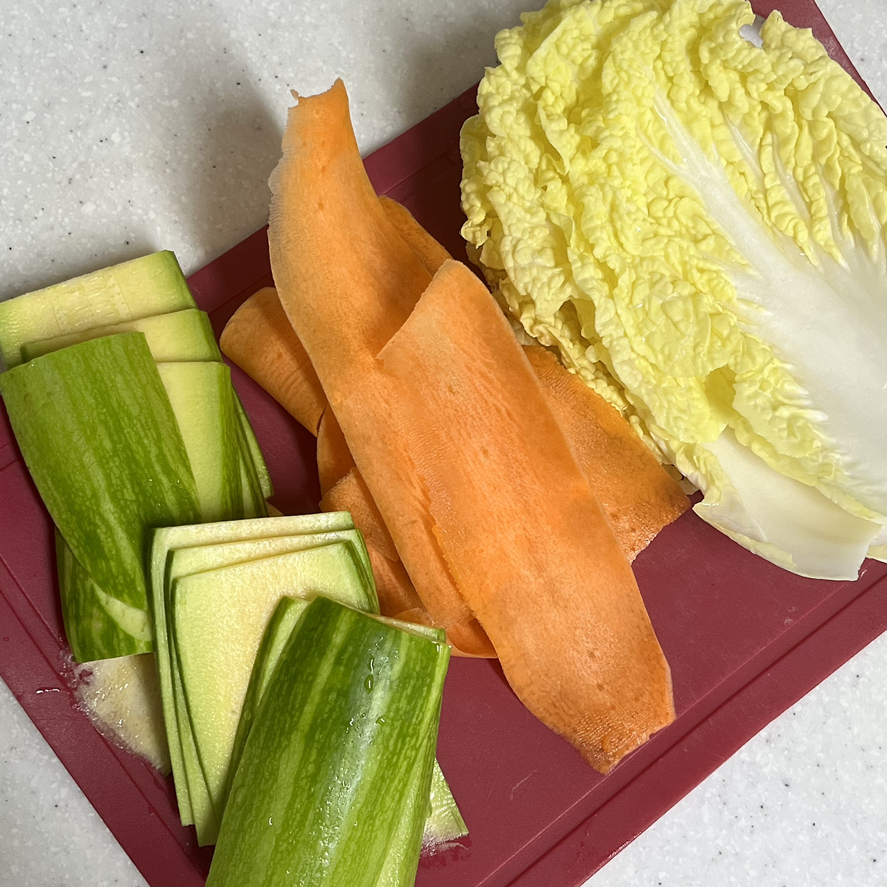 1. 당근은 감자칼로 긁어내 얇게 준비하고, 애호박과 배추는 길고 넓게 썬다.