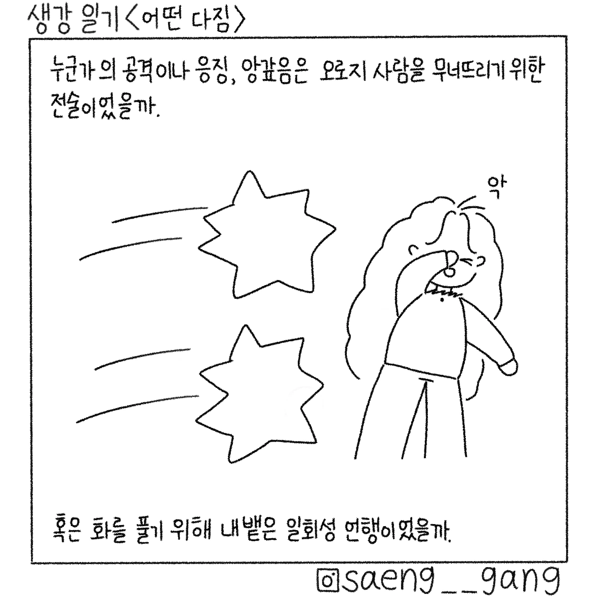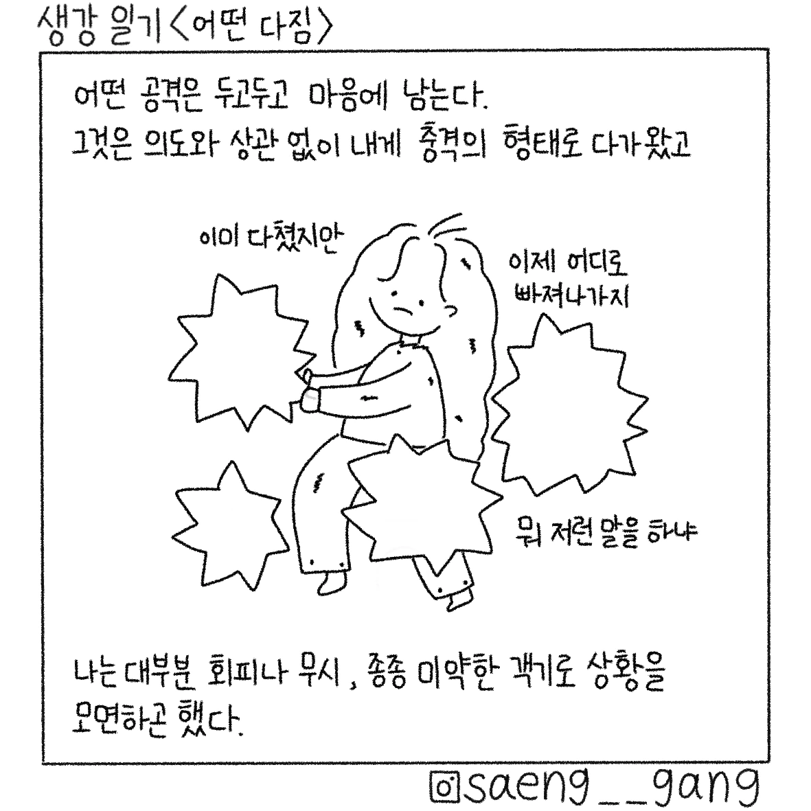어떤 공격은 두고두고 마음에 남는다. 그 문장을 쓰고 한참을 들여다 보았다. 흘려보내지 못해서 고인 말들이 하나둘 튀어올랐다. 그걸 잡아서 갈기갈기 찢어버렸다.