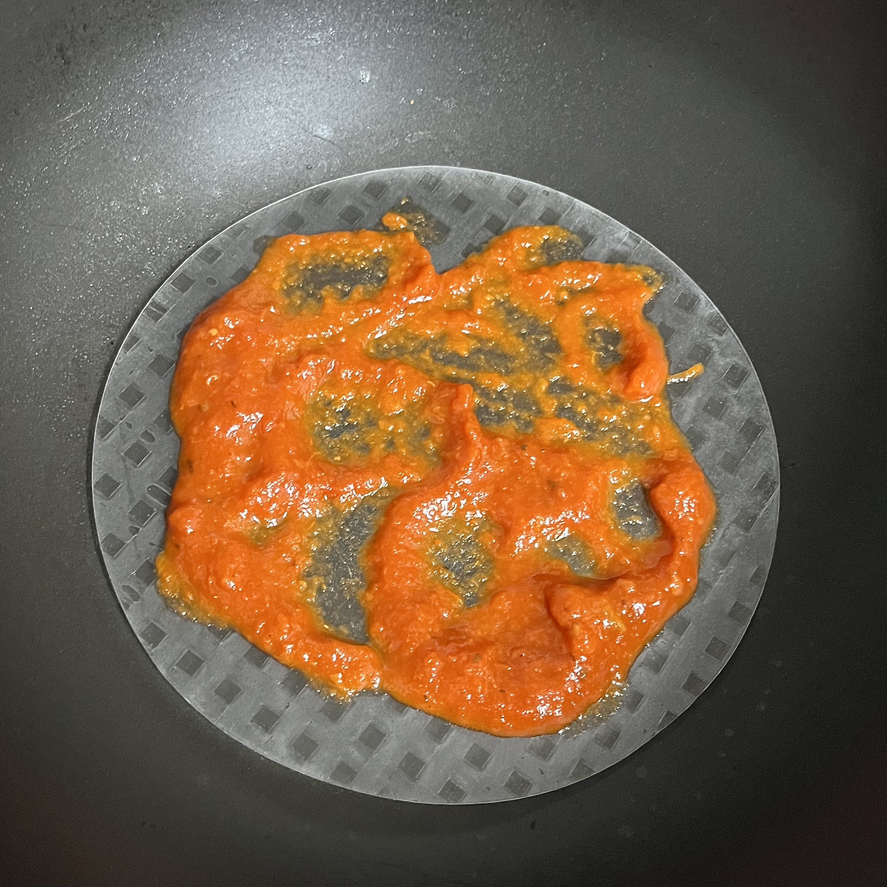 2. 라이스페이퍼가 구워지면사 끝이 말리는데, 그 전에 재빠르게 파스타 소스를 펴바른다.