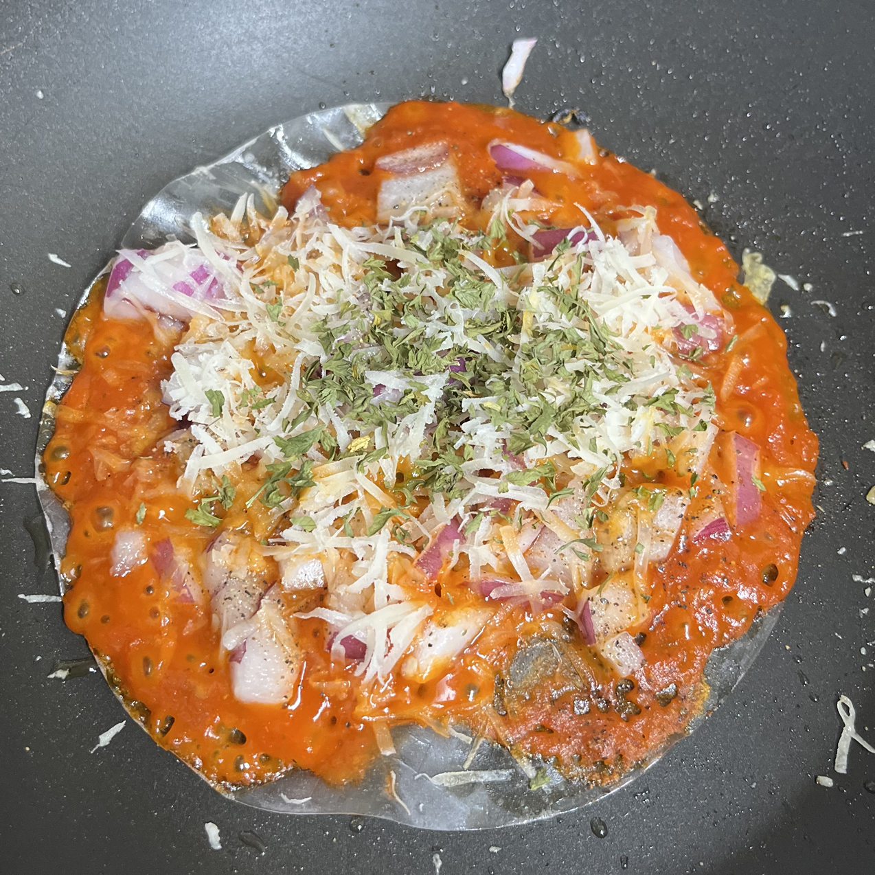 3. 다진 양파를 올리고 비건 치즈를 갈아서 앉은 뒤 마지막으로 파슬리를 뿌리고 뚜껑을 덮은 후 약불~중불에서 굽는다.