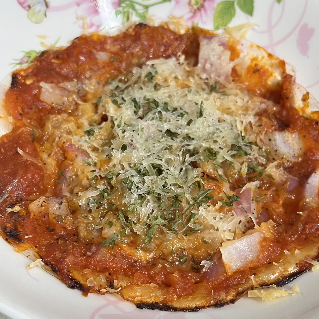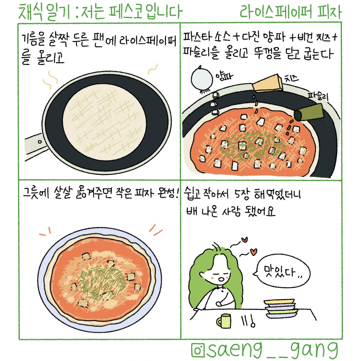 소스는 토마토만 함유된 것으로, 치즈는 비건 치즈로, 토핑은 순수하게 양파로만 맛을 낸 나만의 작은 피자가 완성되었다.