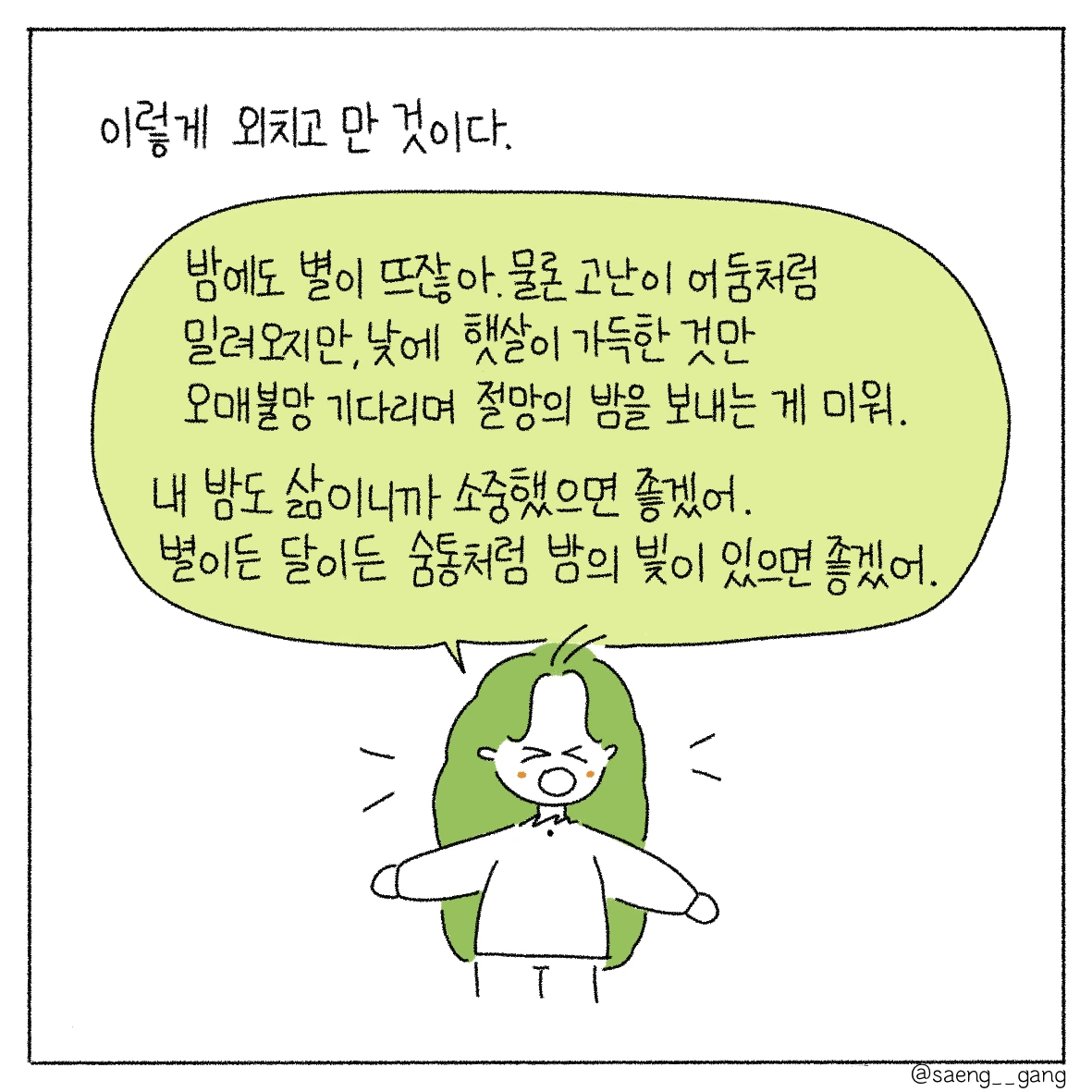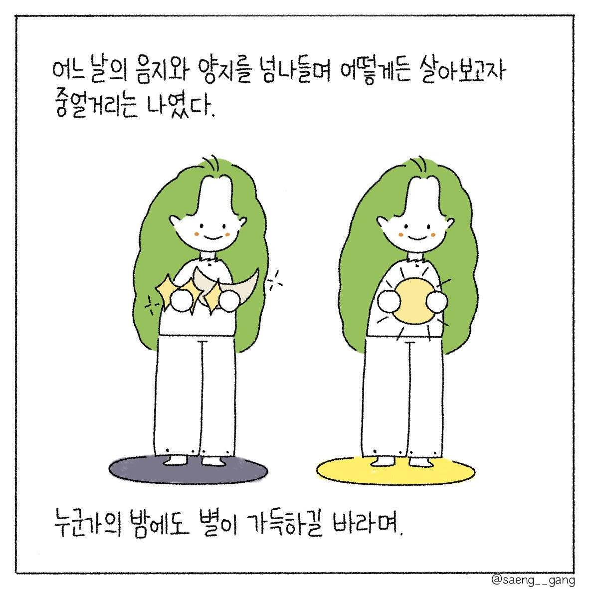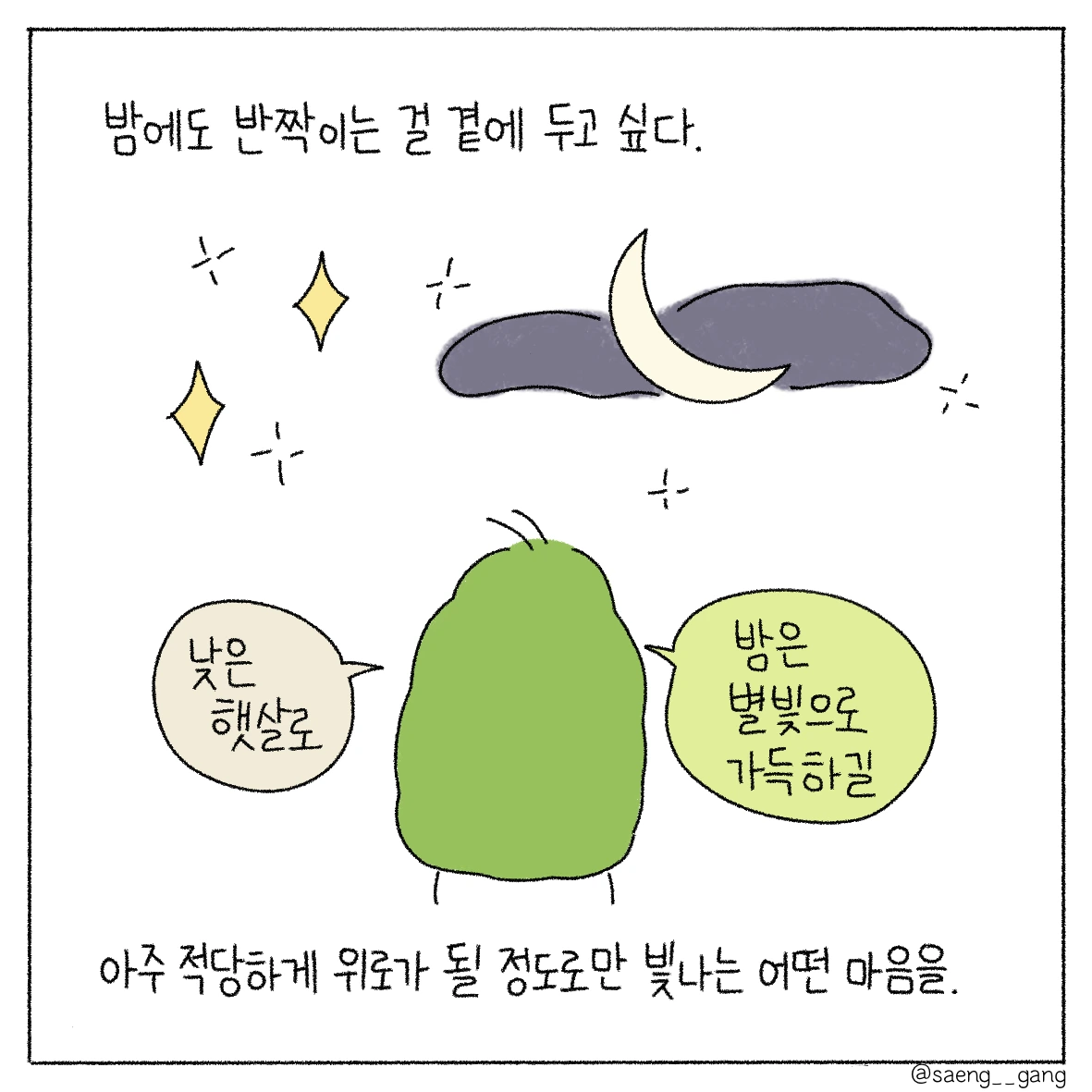 낮은 햇살로 가득하고 밤은 별빛으로 가득한 하루를 보냈으면 좋겠어. 고통스럽고 헛구역질이 나는 밤이어도, 그것도 삶이므로 조금은 빛나는 구석이 있다면 좋겠어.