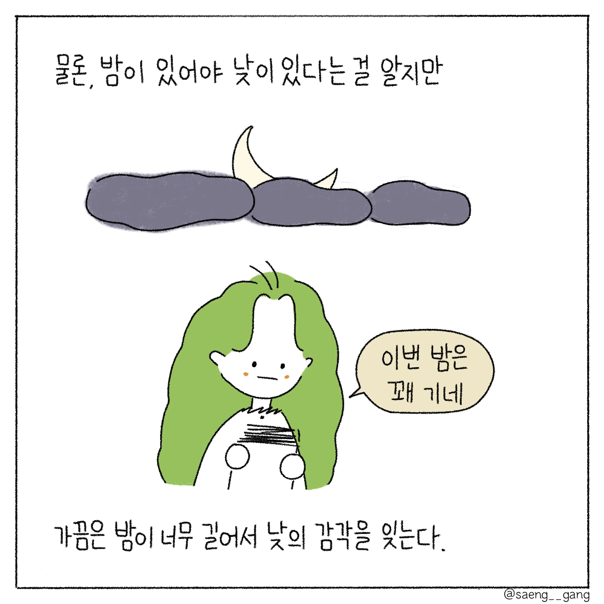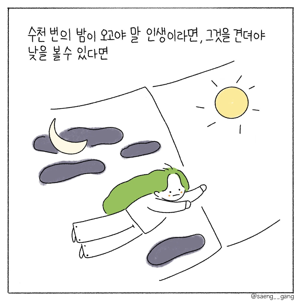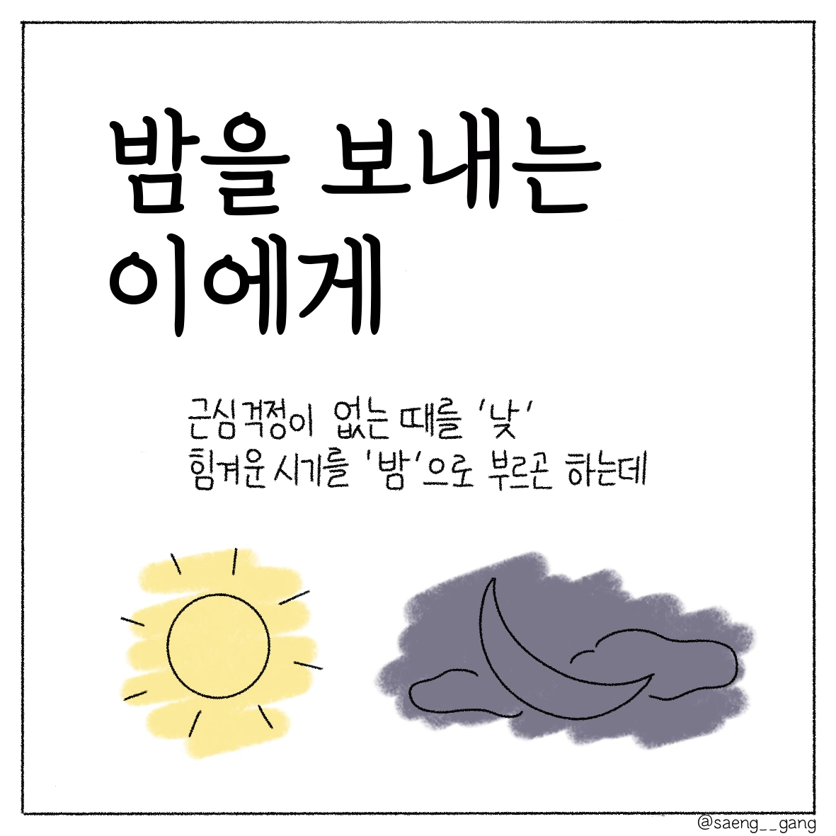 낮은 햇살로 가득하고 밤은 별빛으로 가득한 하루를 보냈으면 좋겠어. 고통스럽고 헛구역질이 나는 밤이어도, 그것도 삶이므로 조금은 빛나는 구석이 있다면 좋겠어.