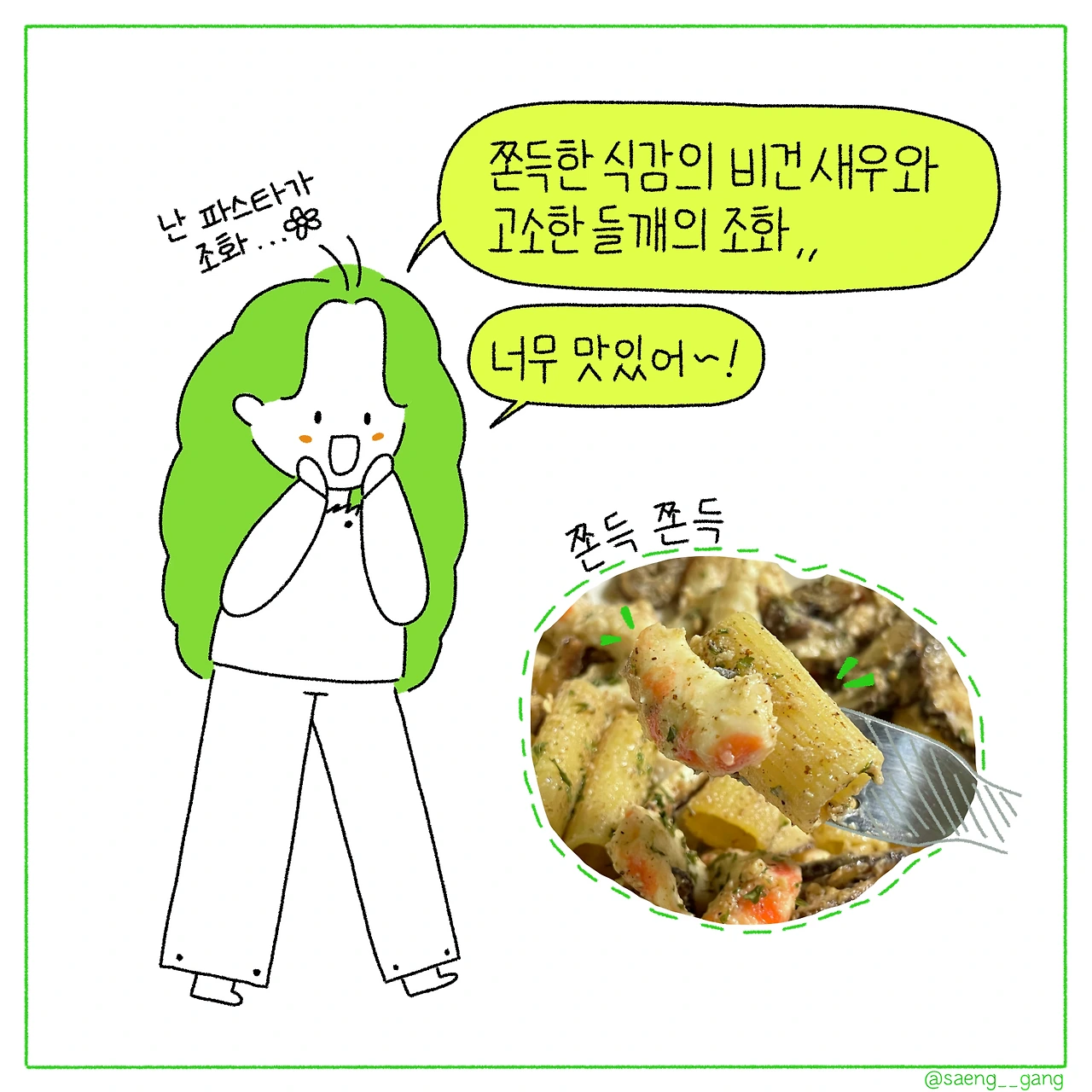 들깨 파스타는 처음 해 보는데, 맛이 생각보다 괜찮았다. 버섯과 새우가 들어가서 푸짐했고 무엇보다 고소한 향과 비건 새우의 조화가 아주 훌륭했다.