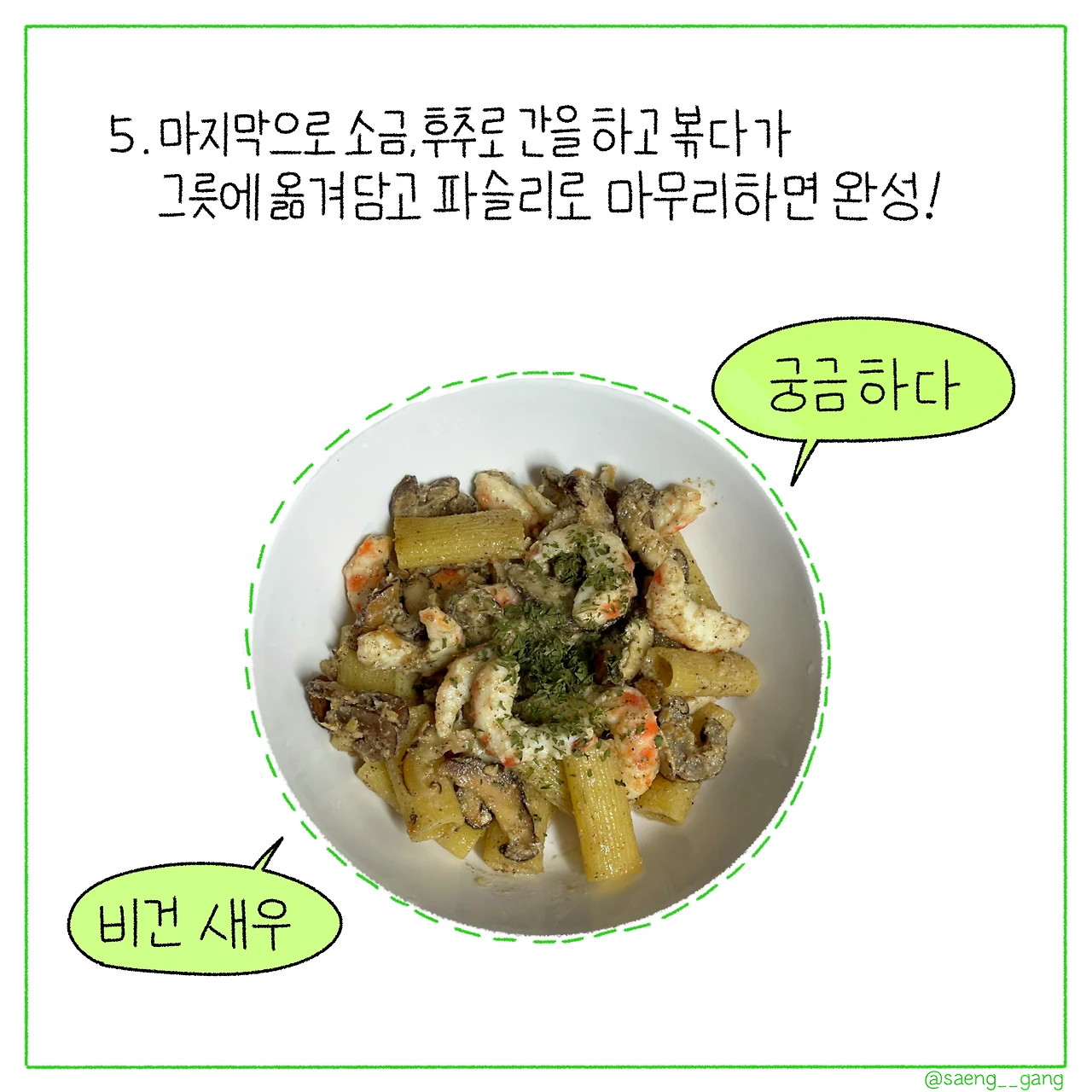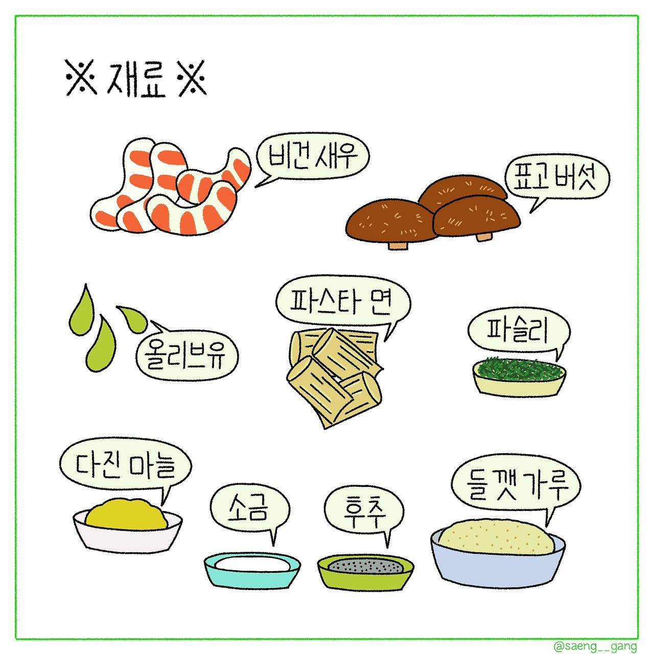비건 새우 / 표고버섯 / 올리브유 / 파스타 면 / 파슬리 / 다진 마늘 / 소금 / 후추 / 들깻가루