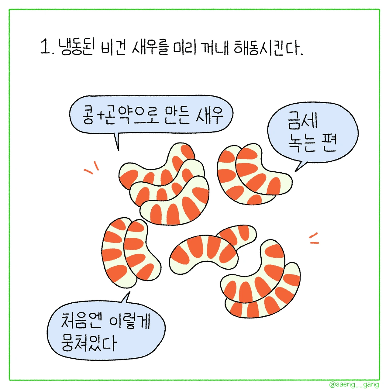 1. 냉동된 비건 새우를 미리 꺼내 해동시켜요.